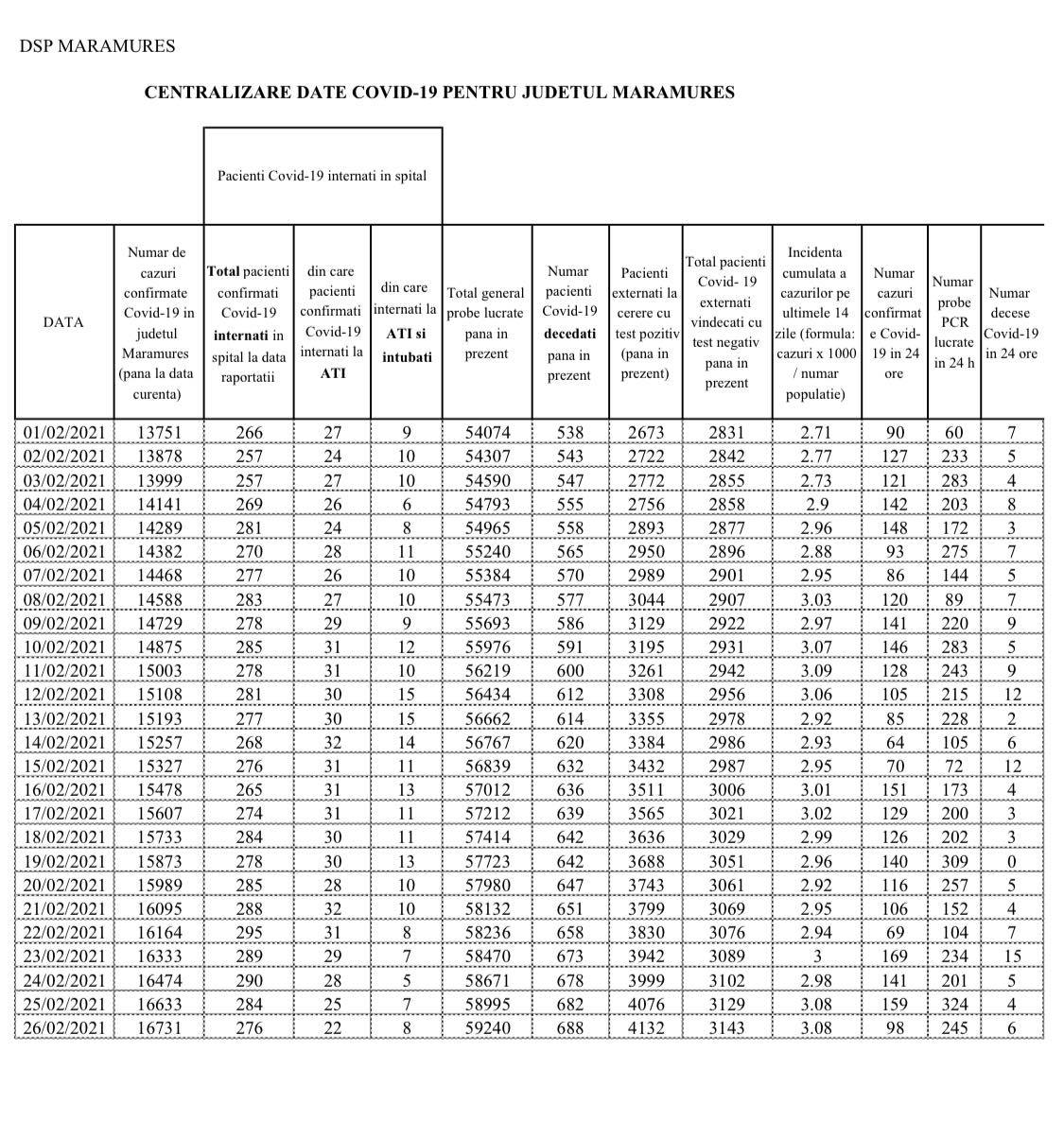 Coronavirus, 26 februarie 2021: S-a ajuns la 688 decese în Maramureș (încă 6)! În județ, în total, 16.731 cazuri de la început (98 noi)