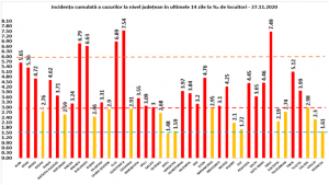 Coeficientul infectărilor cumulate la 14 zile, raportate la 1.000 de locuitori este calculat de către Direcțiile de Sănătate Publică, la nivelul Municipiului București și al județelor. Graficul realizat în baza raportărilor primite de CNCCI de la Direcțiile de Sănătate Publică îl regăsiți la finalul materialului.