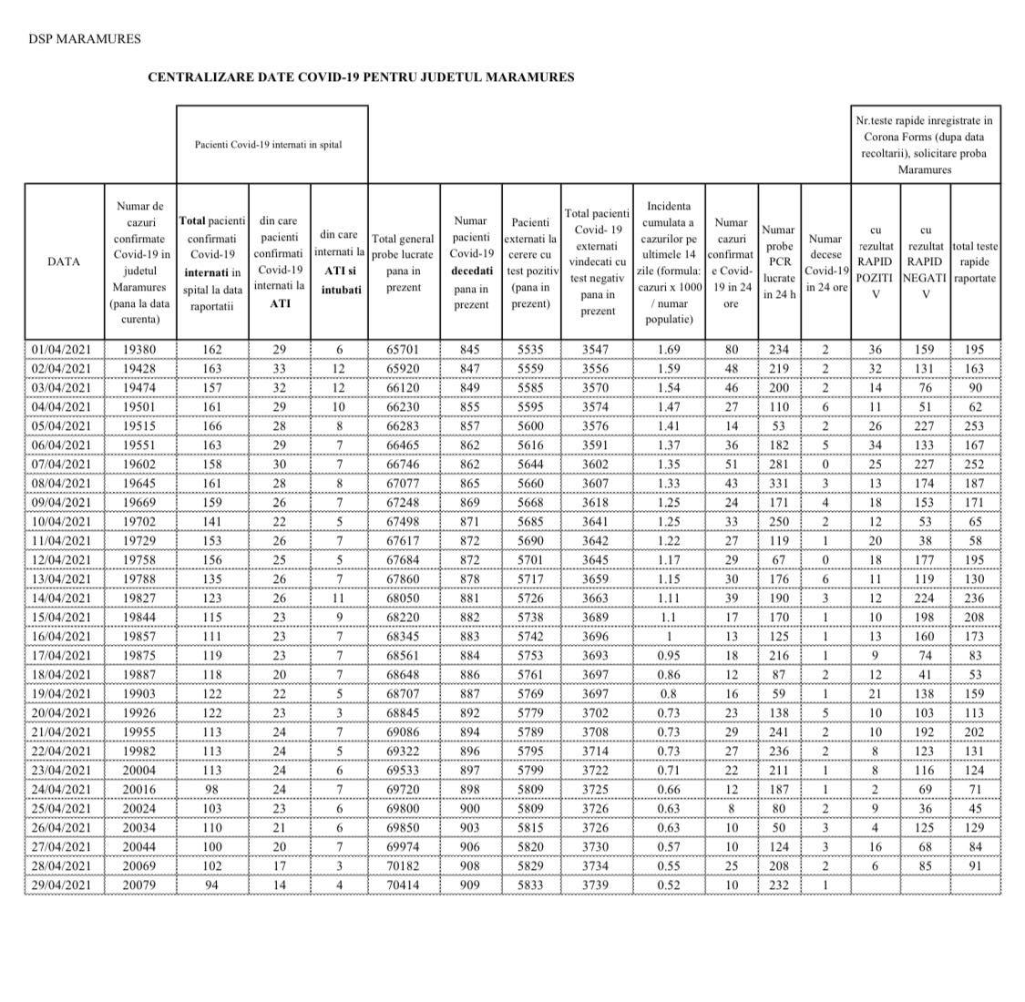Coronavirus, 29 aprilie 2021: S-a ajuns la 909 decese în Maramureș (încă 1)! În județ, în total, 20.079 cazuri de la început (10 noi)