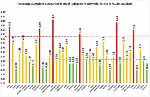 Coeficientul infectărilor cumulate la 14 zile, raportate la 1.000 de locuitori este calculat de către Direcțiile de Sănătate Publică, la nivelul Municipiului București și al județelor. Aveți graficul realizat în baza raportărilor primite de CNCCI de la Direcțiile de Sănătate Publică la finalul materialului.