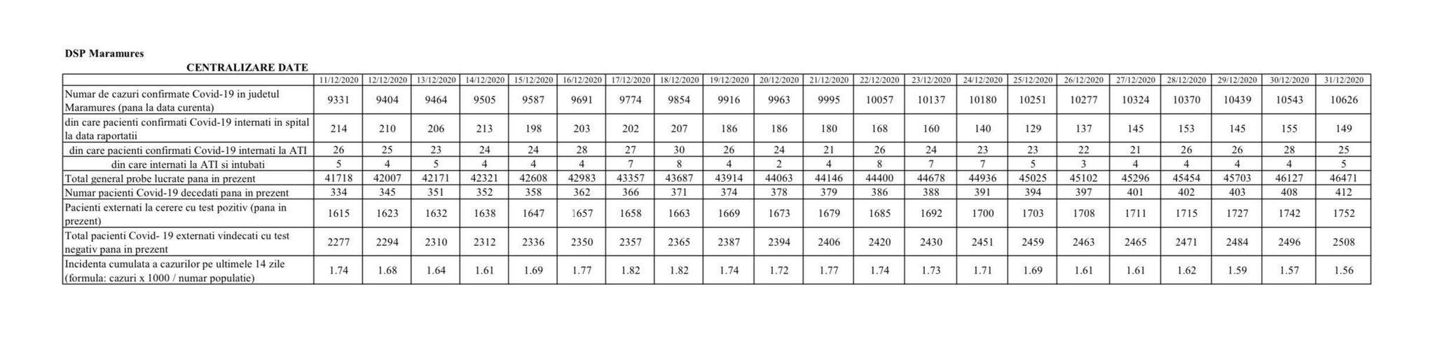 Coronavirus, 31 decembrie 2020: S-a ajuns la 412 decese în Maramureș (încă 4)! În județ, în total, 10.602 cazuri de la început (76 noi)