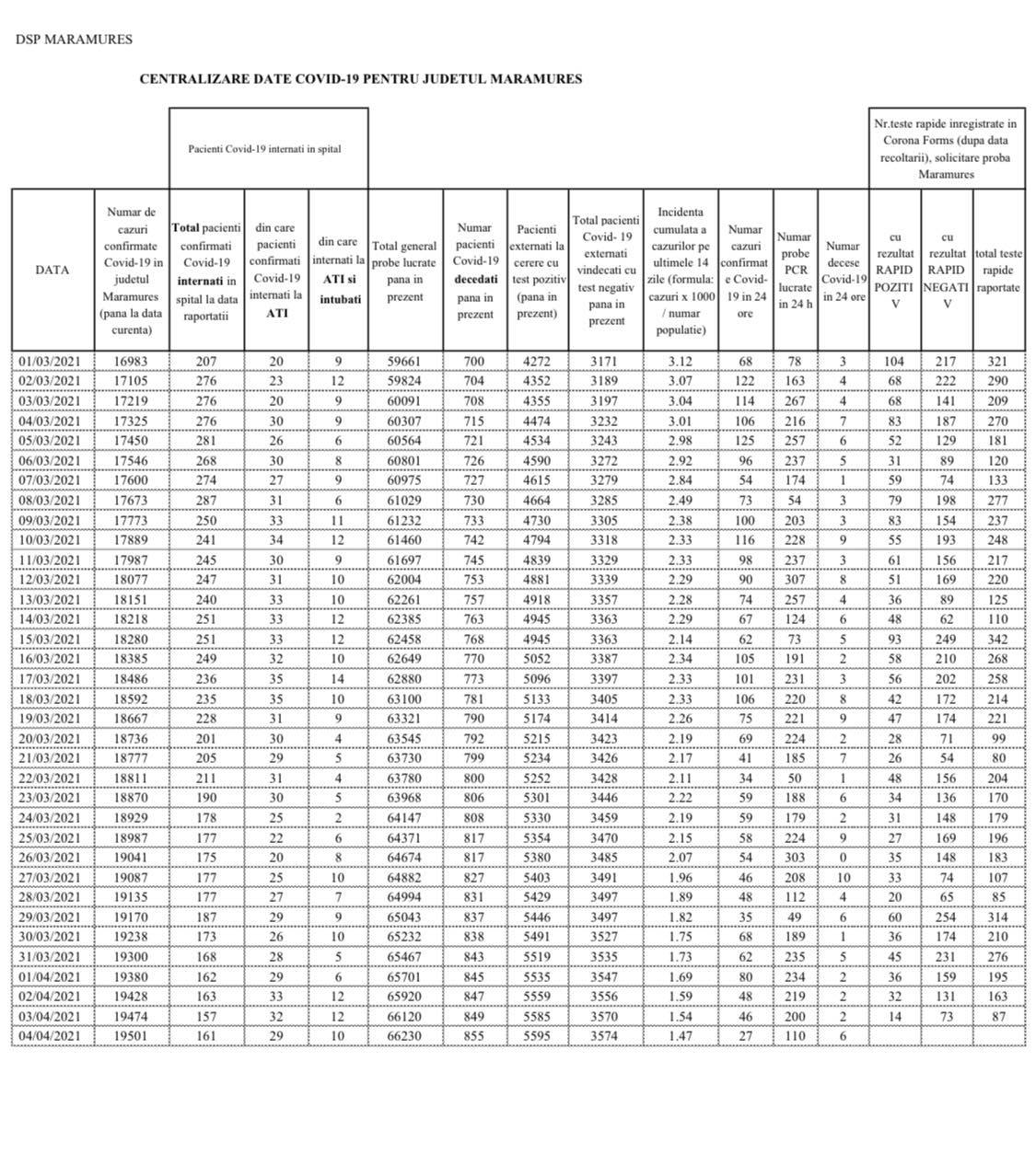 Coronavirus, 4 aprilie 2021: S-a ajuns la 855 decese în Maramureș (încă 6)! În județ, în total, 19.501 cazuri de la început (27 noi)