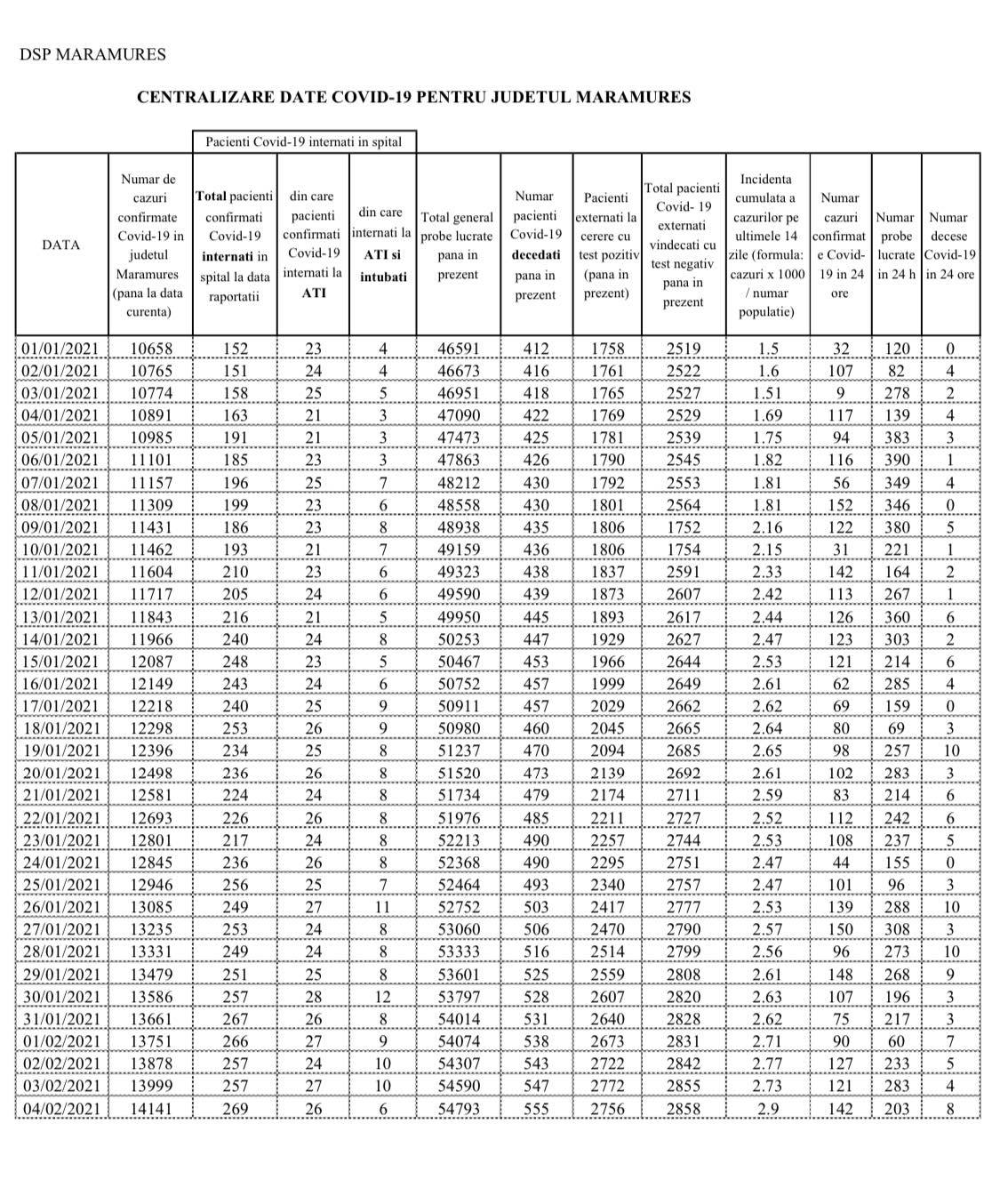 Coronavirus, 4 februarie 2021: S-a ajuns la 553 decese în Maramureș (încă 6)! În județ, în total, 14.132 cazuri de la început (184 noi)