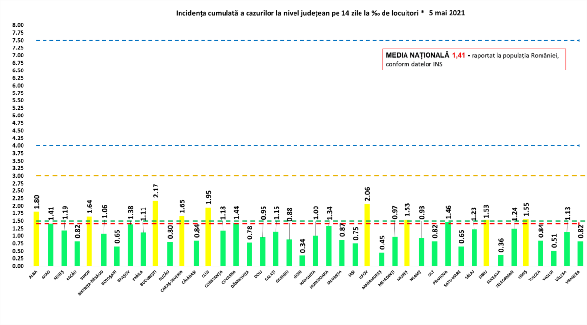 Referitor la cele 17 noi cazuri, acestea sunt din tot județul. În ceea ce privește decesele cu numerele 915 și 916, este vorba despre un bărbat din categoria de vârstă 70-79 de ani și o femeie din categoria de vârstă 60-69 de ani, ambii cu comorbidități. Incidența de cazuri la mia de locuitori a ajuns la 0,45, deci județul se află în scenariul verde. Statistica actualizată a DSP Maramureș, aferentă situației epidemiologice din județ, o regăsiți la finalul materialului. Aici ar fi de făcut o precizare: în cifrele comunicate de Centrul Județean de Coordonare și Conducere a Intervenției, conform protocolului național, apar doar pacienții internați la ATI la spitalul-suport COVID-19, adică Spitalul de Pneumoftiziologie din Baia Mare. În cifrele comunicate de DSP apare totalul de pacienți internați pe secțiile ATI din județ, adică pe lângă cei internați în spitalul-suport, și cei aflați pe secțiile-tampon ATI de la Spitalul Județean Baia Mare și Spitalul Municipal Sighetu Marmației.