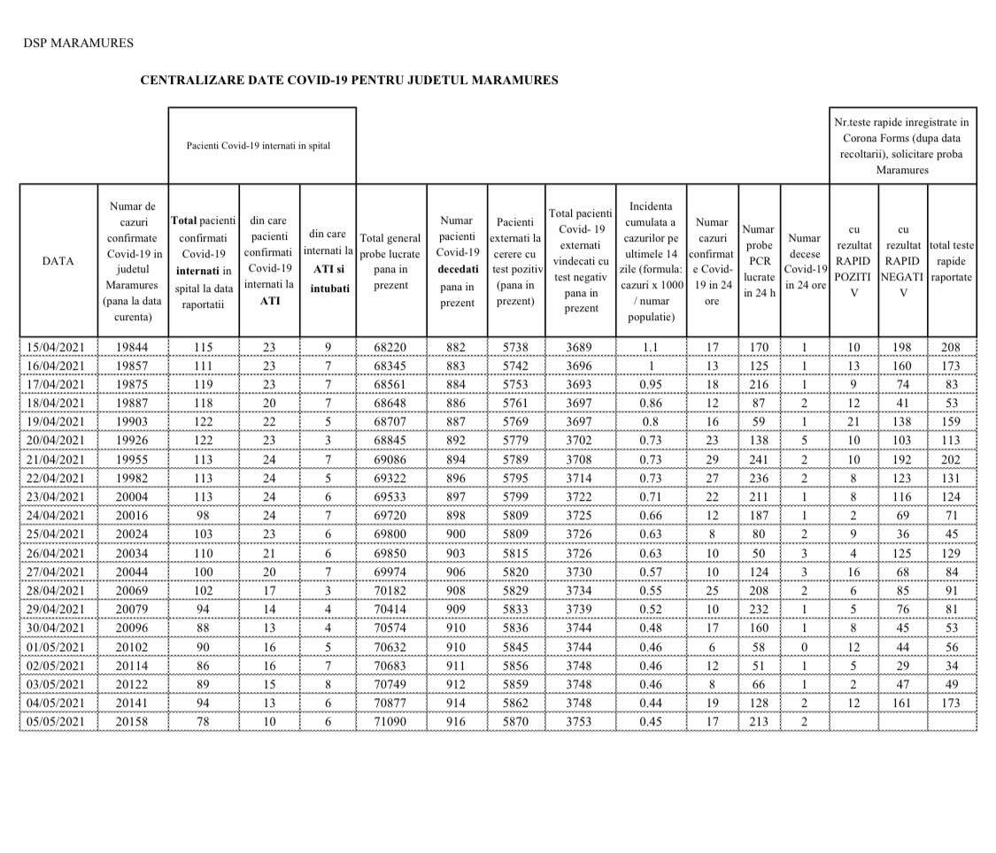 Coronavirus, 5 mai 2021: S-a ajuns la 916 decese în Maramureș (încă 2)! În județ, în total, 20.158 cazuri de la început (17 noi)