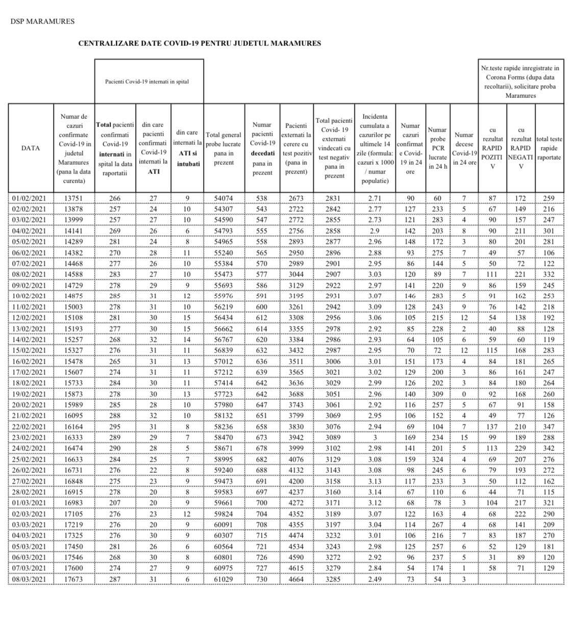 Coronavirus, 8 martie 2021: S-a ajuns la 730 decese în Maramureș (încă 3)! În județ, în total, 17.644 cazuri de la început (40 noi)