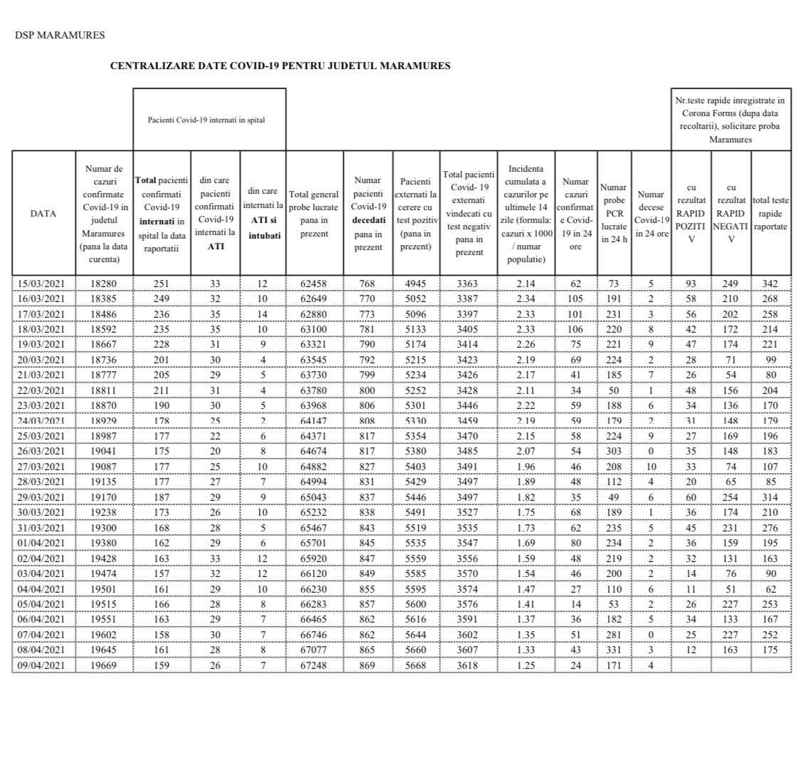 Coronavirus, 9 aprilie 2021: S-a ajuns la 869 decese în Maramureș (încă 4)! În județ, în total, 19.669 cazuri de la început (23 noi)