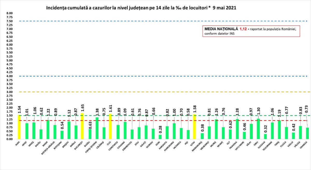 Referitor la cele 7 noi cazuri, acestea sunt din tot județul. În ceea ce privește decesul cu numărul 922, este vorba despre o femeie din categoria de vârstă 60-69 de ani, care a prezentat comorbidități. Incidența de cazuri la mia de locuitori a ajuns la 0,38, deci județul se află în scenariul verde. Statistica actualizată a DSP Maramureș, aferentă situației epidemiologice din județ, o regăsiți la finalul materialului. Aici ar fi de făcut o precizare: în cifrele comunicate de Centrul Județean de Coordonare și Conducere a Intervenției, conform protocolului național, apar doar pacienții internați la ATI la spitalul-suport COVID-19, adică Spitalul de Pneumoftiziologie din Baia Mare. În cifrele comunicate de DSP apare totalul de pacienți internați pe secțiile ATI din județ, adică pe lângă cei internați în spitalul-suport, și cei aflați pe secțiile-tampon ATI de la Spitalul Județean Baia Mare și Spitalul Municipal Sighetu Marmației.