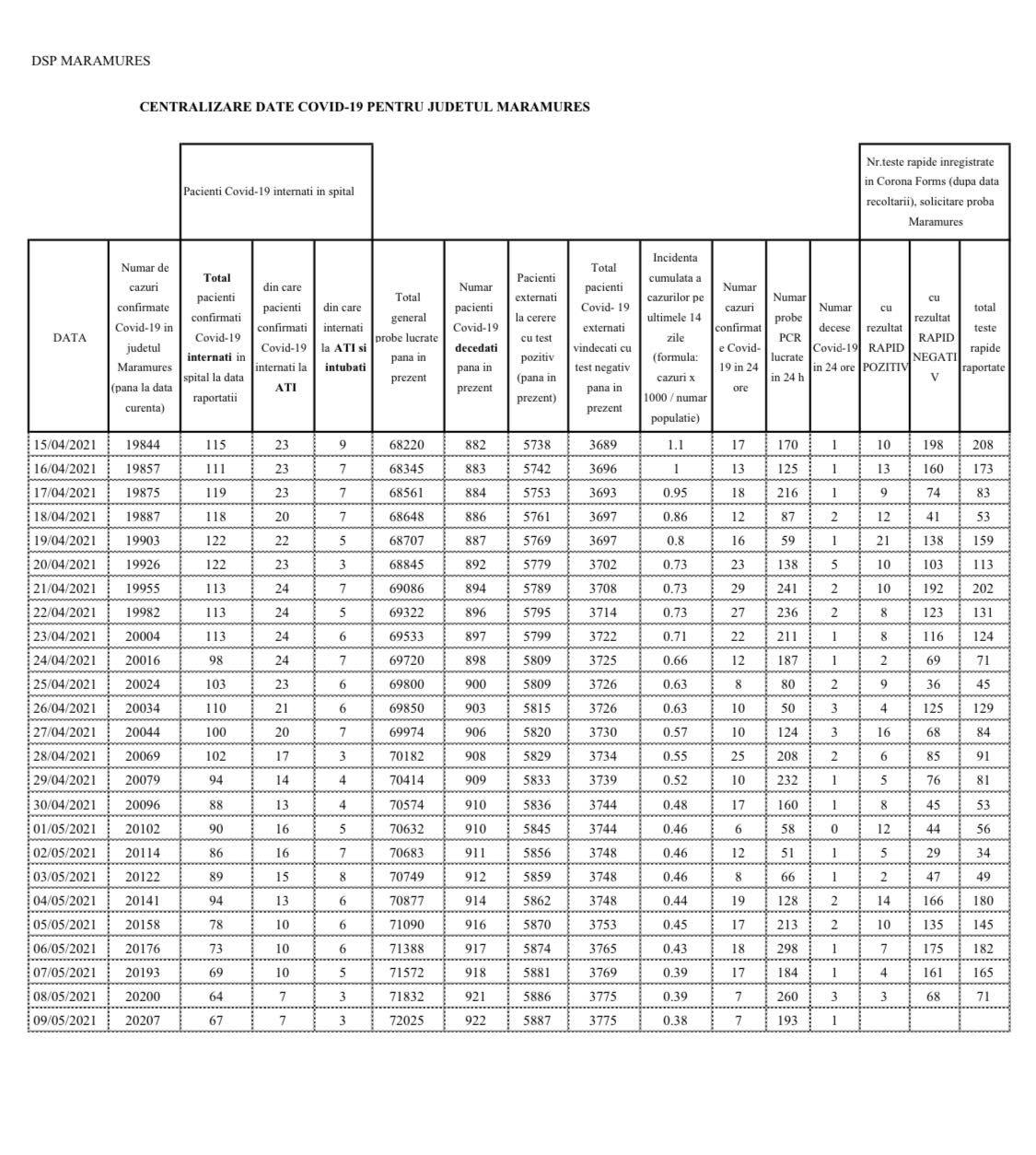 Coronavirus, 9 mai 2021: S-a ajuns la 922 decese în Maramureș (încă 1)! În județ, în total, 20.207 cazuri de la început (7 noi)