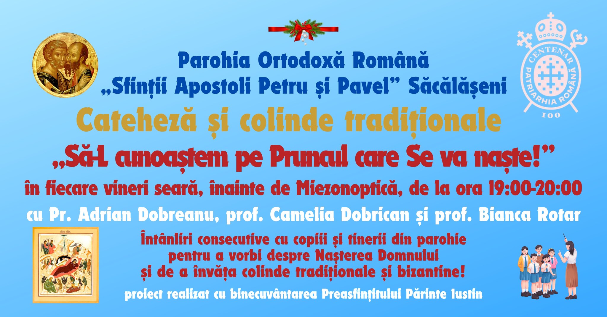 Cu binecuvântarea Preasfințitului Părinte Iustin, în cele șase vineri ale Postului Nașterii Domnului, Parohia Ortodoxă Săcălășeni organizează întâlniri cu copiii și tinerii din parohie și împrejurimi, în cadrul Proiectului „Cateheză și colinde tradiționale: Să-L cunoaștem pe Pruncul care Se va naște”.