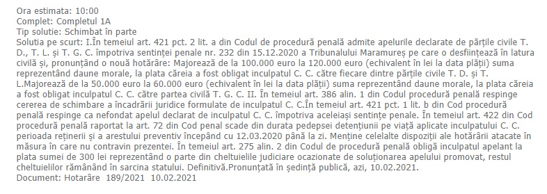 „I.În temeiul art. 421 pct. 2 lit. a din Codul de procedură penală admite apelurile declarate de părţile civile T. D., T. L. şi T. G. C. împotriva sentinţei penale nr. 232 din 15.12.2020 a Tribunalului Maramureş pe care o desfiinţează în latura civilă şi, pronunţând o nouă hotărâre: Majorează de la 100.000 euro la 120.000 euro (echivalent în lei la data plăţii) suma reprezentând daune morale, la plata căreia a fost obligat inculpatul C. C. către fiecare dintre părţile civile T. D. şi T. L. Majorează de la 50.000 euro la 60.000 euro (echivalent în lei la data plăţii) suma reprezentând daune morale, la plata căreia a fost obligat inculpatul C. C. către partea civilă T. G. C. II. În temeiul art. 386 alin. 1 din Codul procedură penală respinge cererea de schimbare a încadrării juridice formulate de inculpatul C. C.În temeiul art. 421 pct. 1 lit. b din Cod procedură penală respinge ca nefondat apelul declarat de inculpatul C. C. împotriva aceleiaşi sentinţe penale. În temeiul art. 422 din Cod procedură penală raportat la art. 72 din Cod penal scade din durata pedepsei detenţiunii pe viaţă aplicate inculpatului C. C. perioada reţinerii şi a arestului preventiv începând cu 12.03.2020 până la zi. Menţine celelalte dispoziţii ale hotărârii atacate în măsura în care nu contravin prezentei. În temeiul art. 275 alin. 2 din Codul de procedură penală obligă inculpatul apelant la plata sumei de 300 lei reprezentând o parte din cheltuielile judiciare ocazionate de soluţionarea apelului promovat, restul cheltuielilor rămânând în sarcina statului. Definitivă.Pronunţată în şedinţă publică, azi, 10.02.2021. Document: Hotarâre 189/2021 10.02.2021”, se arată în soluția pe scurt (vezi mai jos fotocaptură de pe portalul instanței).