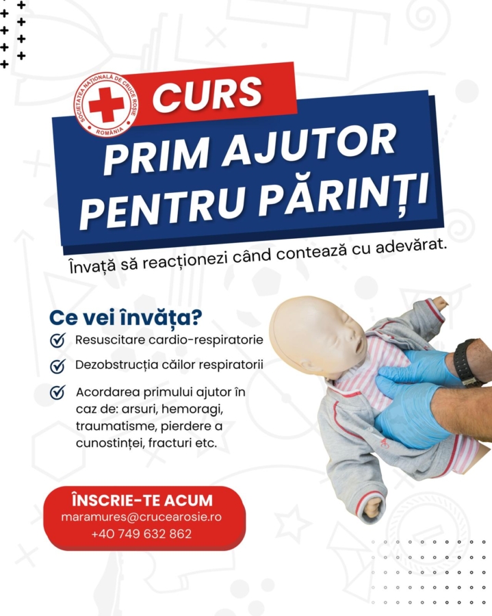 Crucea Roșie Română- Filiala Maramureș organizează, în data de 5 martie de la ora 10:00, un curs de prim ajutor dedicat părinților și viitorilor părinți, vizând intervenția rapidă în momentele critice când fiecare secundă contează.