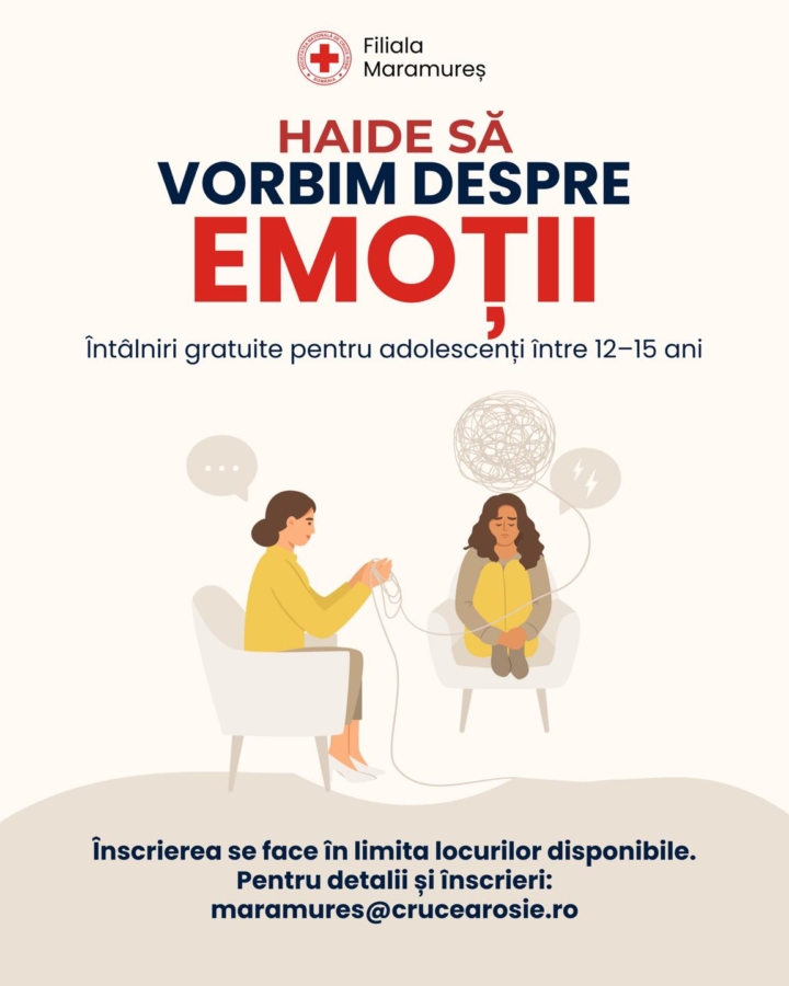 Întrucât adolescența este perioada în care emoțiile și provocările vieții se simt la intensitate maximă, Crucea Roșie Română- Filiala Maramureș organizează întâlniri gratuite de grup pentru adolescenți cu vârste între 12–15 ani, facilitate de doamna psiholog clinician Melinda Szilagyi într-un spațiu sigur și structurat.