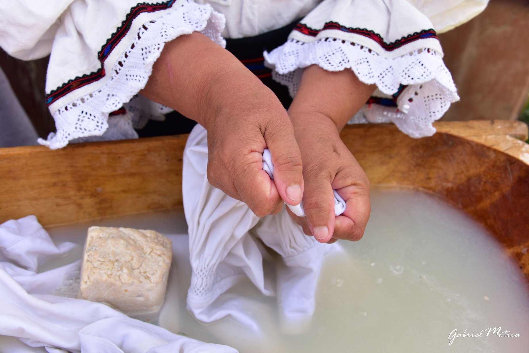 „Cămașa de sărbători se spăla un pic mai cu grijă decât celelalte. Cele de sărbătoare se spălau cu apă călduță, deci cu grijă, că nu poți să pui cămașa cu gatiile de la arat. Celelalte se puneau într-o bărbanță și avea jos un butoi pe care se puneau două lemne și bărbânța acolo peste. Se puneau hainele deasupra, apoi un cenușar, o bucată de pâ nză cu leșie, de obicei din paie de ovăz. Și se turna apă fierbinte peste. Și se lăsa până a doua zi. Apoi se puneau într-o coșarcă și se duceau la râu și se prănicau bine, să iasă leșia din ele” (Maria Șerba, Călinești), transmite Corina Isabella Csiszár din cadrul Centrului Culturii Tradiționale Maramureș.