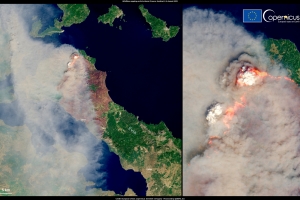 Pe site-ul programului Copernicus au fost publicate mai multe imagini făcute de sateliții Sentinel, care surprind proporțiile dezastrului din Evia. Una din fotografii este compusă din două imagini alăturate, practic același cadru surprins din spațiu la o distanță de zece zile: pe 1 august, când partea de nord a insulei Evia este complet înverzită, și pe 11 august, după izbucnirea incendiilor, când se vede clar cât de tare a fost pârjolită insula.