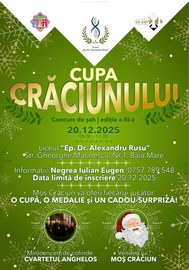 Concursul de șah „Cupa Crăciunului” aflat la ediția cu numărul 3 este organizat de către Academia de Șah Maramureș, în parteneriat cu Grădinița de Șah și va avea loc, în data de 20 decembrie, în intervalul orar 09:00-13:30, la Liceul „Ep. Dr. Alexandru Rusu” Baia Mare.