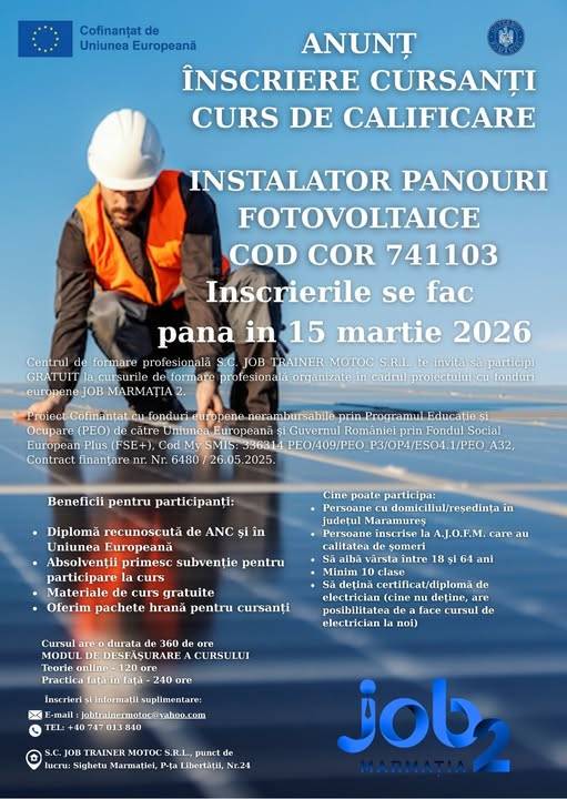 Centrul de formare profesională S.C. JOB TRAINER MOTOC S.R.L. anunță înscrierile pentru un curs gratuit de calificare în domeniul instalării panourilor fotovoltaice, cod COR 741103. Cursul este organizat în cadrul unui proiect european cofinanțat și se adresează persoanelor din județul Maramureș care doresc să dobândească competențe profesionale recunoscute la nivel național și european.