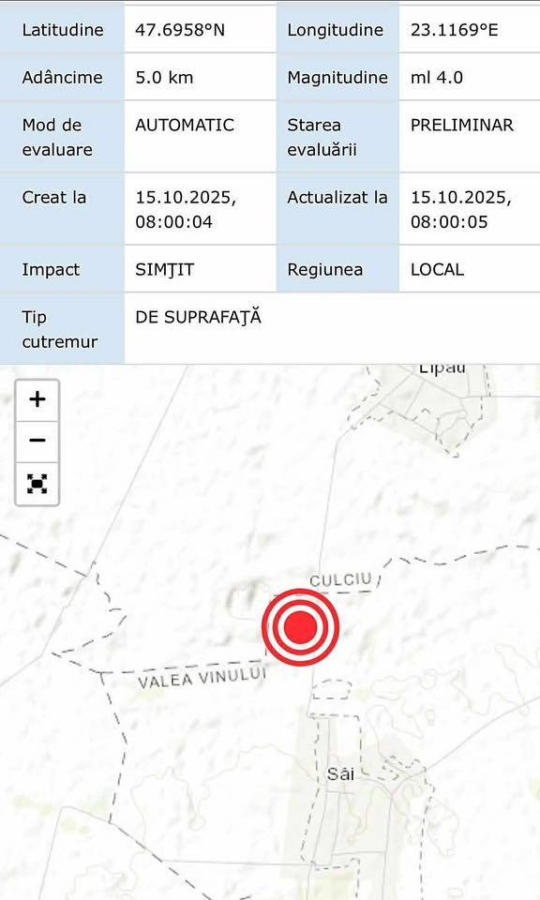 Un cutremur cu magnitudinea de 4 grade pe scara Richter s-a produs în această dimineață, în jurul orei 07:57, în județul Satu Mare. Potrivit datelor preliminare, seismul a avut loc la o adâncime de aproximativ 35 de kilometri.