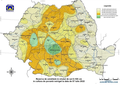 Ar fi de spus că în data de 7 iulie, în cultura de porumb neirigat, conținutul de umiditate pe adâncimea de sol 0-100 cm, se situează la limite scăzute și deosebit de scăzute, seceta pedologică fiind moderată, puternică și extremă, în Dobrogea, Maramureș și Banat, pe suprafețe agricole extinse din Moldova, Transilvania și Crișana, local în nordul, estul, sud-vestul, sudul, sud-estul Munteniei, sudul, centrul și estul Olteniei. Rezerva de apă din sol prezintă valori satisfăcătoare, apropiate de optim și izolat optime, local în nordul, vestul, sudul și centrul Munteniei, nordul, vestul și estul Olteniei, sudul, centrul, nordul și nord-estul Transilvaniei, nord-vestul și izolat centrul Moldovei, sud-estul Crișanei. Așadar, azi, 7 iulie, vom avea vreme frumoasă și plăcută, apoi puțin schimbătoare dar plăcută până în 14 iulie, când se întrevede o nouă încălzire și posibil caniculă, arșiță, disconfort termic, treptat, desigur.