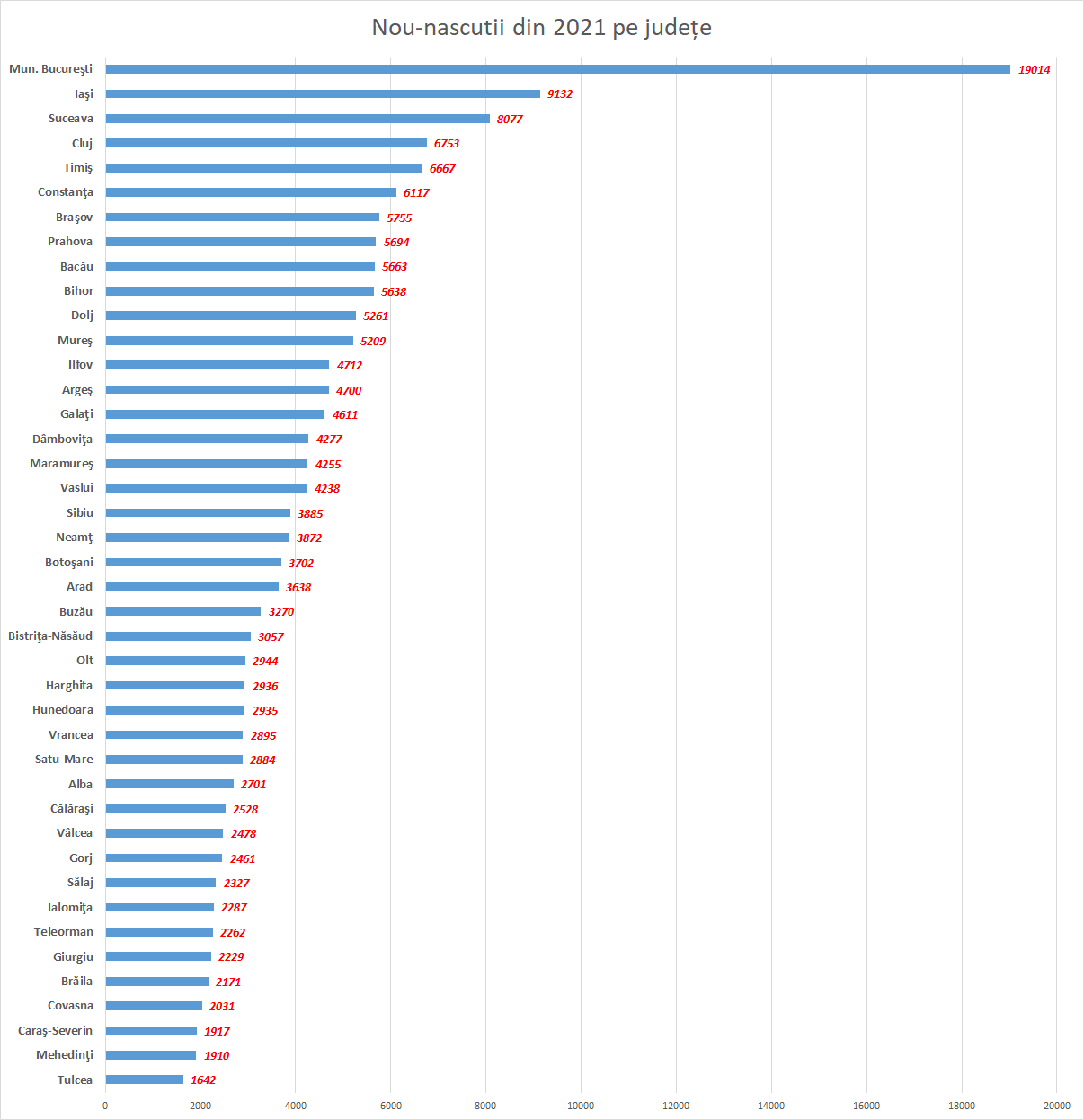 Fertilitatea feminină a fost cuprinsă între 44,5 născuţi-vii la 1000 femei de vârstă fertilă în judeţul Suceava şi 27,5 născuţi-vii la 1000 femei de vârstă fertilă în judeţul Caraş-Severin. Rate scăzute ale fertilităţii (sub 30 născuţi-vii la 1000 femei de vârstă fertilă) s-au înregistrat şi în judeţele: Brăila, Gorj, Hunedoara, Neamţ şi Vâlcea. În mediul rural, rata fertilităţii este superioară celei din mediul urban (38,7 faţă de 32,0 născuţi vii la 1000 femei de vârstă fertilă). Rata natalităţii a fost de 8,2 născuţi-vii la 1000 locuitori, mai ridicată în mediul rural (8,9 născuţi-vii la 1000 locuitori) faţă de mediul urban (7,6 născuţi-vii la 1000 locuitori). Rata natalităţii s-a situat în anul 2021 între 10,6 născuţi-vii la 1000 locuitori în judeţul Suceava şi 6,1 născuţi-vii la 1000 locuitori în judeţul Caraş-Severin. Dintre judeţele cu o natalitate ridicată (peste 9 născuţi-vii la 1000 locuitori) se numără şi judeţele: Bihor, Bistriţa-Năsăud, Cluj, Iaşi, Ilfov şi Sălaj. Rate scăzute de natalitate (sub 7 născuţi-vii la 1000 locuitori) s-au înregistrat şi în judeţele Brăila, Hunedoara, Mehedinţi, Neamţ, Olt, Teleorman, şi Vâlcea.