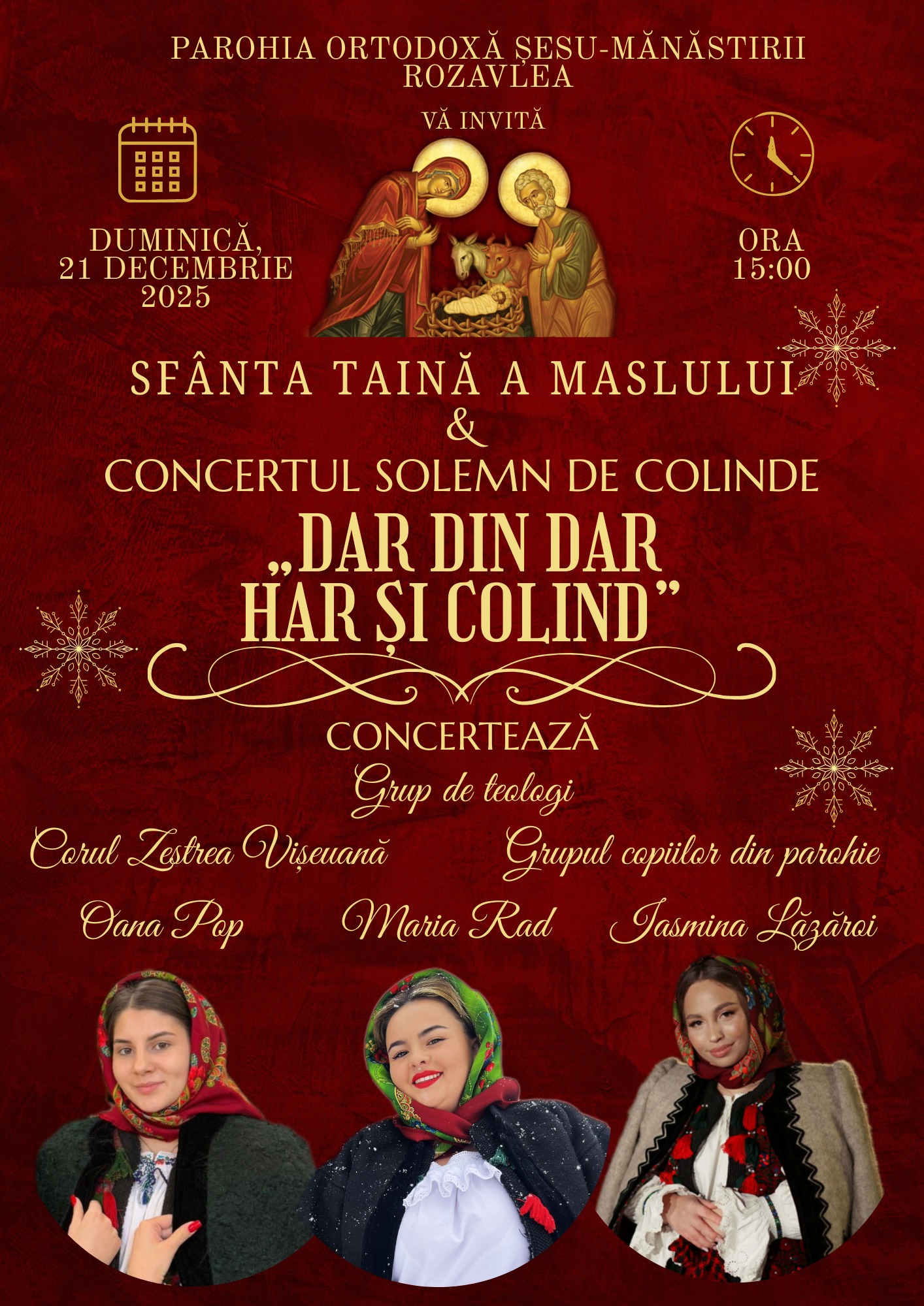 „Iubiți credincioși, cu binecuvântarea și purtarea de grijă a Preasfințitului Părintelui nostru Iustin, cu multă bucurie și dragoste, vă invităm duminică, 21 decembrie, începând cu ora 15:00, la săvârșirea Sfintei Taine a Maslului, în sobor de 7 preoți, urmată de prima ediție a concertului caritabil „Dar din dar, har și colind”.
