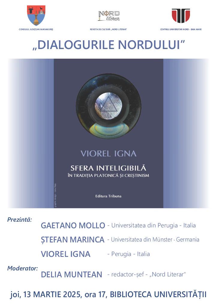De la ora 17:00, Viorel Igna, profesor de filosofie stabilit în Italia, va susține conferința „Sfera inteligibilă în tradiția platonică și creștinism” despre cartea cu titlul omonim publicată de curând și care are la bază teza de doctorat susținută în la Școala Doctorală de Filosofie (IOSUD-UTCN) din Baia Mare, sub îndrumarea prof. emerit Petru Dunca. Alături de autor vor mai prezenta și profesorii Gaetano Mollo de la Universitatea din Perugia, Italia, și Ștefan Marinca de la Universitatea din Münster, Germania. Moderatoarea evenimentului va fi dr. Delia Muntean, redactor-șef al Revistei de Cultură „Nord Literar” și profesoară la Colegiul Național „Vasile Lucaciu” din Baia Mare. Evenimentul are loc în cadrul conferințelor „Dialogurile Nordului”, organizate de revista de cultură Nord Literar în parteneriat cu Centrul Universitar Nord din Baia Mare, anunță Catedra de Filosofie din cadrul Centrului Universitar Nord Baia Mare.