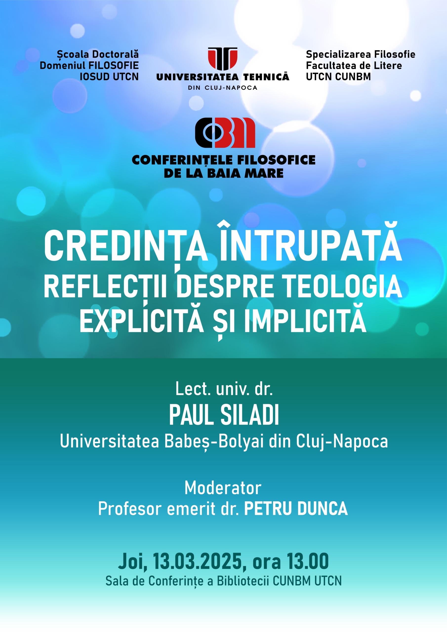 De la ora 13:00, Paul Siladi, lector la Facultatea de Teologie Ortodoxă din Cluj-Napoca, va susține conferința „Credința întrupată. Reflecții despre teologia explicită și implicită”. Moderatorul evenimentului va fi prof. emerit dr. Petru Dunca, profesor de filosofie la Centrul Universitar Nord din Baia Mare și membru fondator în cadrul Școlii Doctorale de Filosofie (IOSUD-UTCN) de la Baia Mare. Evenimentul are loc în cadrul „Conferințelor Filosofice de la Baia Mare”, organizate de Școala Doctorală de Filosofie IOSUD-UTCN și de Specializarea Filosofie, Facultatea de Litere, UTCN-CUNBM.