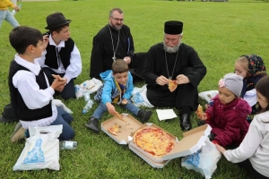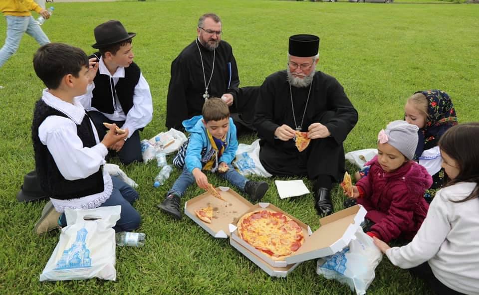 Aici, Preasfinţitul Părinte Episcop Iustin s-a rugat împreună cu copiii, s-au închinat la icoane, a făcut o cateheză pe înţelesul lor, au recitat poezii şi au cântat, s-au fotografiat, copiii şi profesorii însoţitori au primit câte o icoană la care să se închine, iar la sfârşit au stat de vorbă pe iarba din curtea Catedralei, unde copiii au mâncat pizza, un preparat cu care se întâlnesc foarte rar sau deloc în satul în care trăiesc.