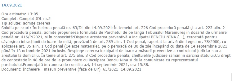 Iată soluția pe scurt! „Încheierea penală nr. 63/DL din 14.09.2021:În temeiul art. 226 Cod procedură penală şi a art. 223 alin. 2 Cod procedură penală, admite propunerea formulată de Parchetul de pe lângă Tribunalul Maramureş în dosarul de urmărire penală nr. 416/P/2021, şi în consecinţă:Dispune arestarea preventivă a inculpatei BENCIU NINA (…), cercetată pentru săvârşirea infracţiunii de luare de mită, prevăzută de art. 289 alin. 1 Cod penal, raportat la art. 6 din Legea nr. 78/2000, cu aplicarea art. 35 alin. 1 Cod penal (14 acte materiale), pe o perioadă de 30 de zile începând cu data de 14 septembrie 2021 până în 13 octombrie 2021 inclusiv. Respinge cererea inculpatei de luare a măsurii preventive a controlului judiciar sau a arestului la domiciliu. În temeiul art. 275 alin. 3 Cod procedură penală, cheltuielile judiciare rămân în sarcina statului.Cu drept de contestaţie în 48 de ore de la pronunţare cu inculpata Benciu Nina şi de la comunicare cu reprezentantul parchetului.Pronunţată în camera de consiliu azi, 14 septembrie 2021, ora 15:38”, se arată în soluția pe scurt!