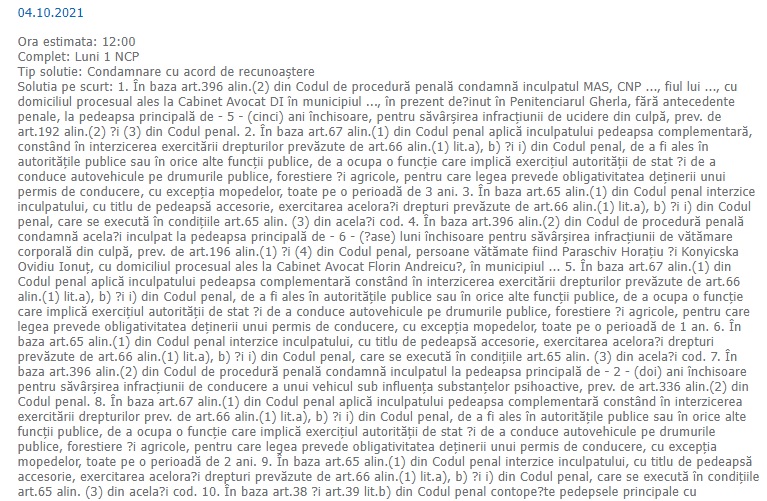 „Solutia pe scurt: 1. În baza art.396 alin.(2) din Codul de procedură penală condamnă inculpatul MAS, CNP …, fiul lui …, cu domiciliul procesual ales la Cabinet Avocat DI în municipiul …, în prezent de?inut în Penitenciarul Gherla, fără antecedente penale, la pedeapsa principală de – 5 – (cinci) ani închisoare, pentru săvârşirea infracţiunii de ucidere din culpă, prev. de art.192 alin.(2) ?i (3) din Codul penal. 2. În baza art.67 alin.(1) din Codul penal aplică inculpatului pedeapsa complementară, constând în interzicerea exercitării drepturilor prevăzute de art.66 alin.(1) lit.a), b) ?i i) din Codul penal, de a fi ales în autorităţile publice sau în orice alte funcţii publice, de a ocupa o funcţie care implică exerciţiul autorităţii de stat ?i de a conduce autovehicule pe drumurile publice, forestiere ?i agricole, pentru care legea prevede obligativitatea deţinerii unui permis de conducere, cu excepţia mopedelor, toate pe o perioadă de 3 ani. 3. În baza art.65 alin.(1) din Codul penal interzice inculpatului, cu titlu de pedeapsă accesorie, exercitarea acelora?i drepturi prevăzute de art.66 alin.(1) lit.a), b) ?i i) din Codul penal, care se execută în condiţiile art.65 alin. (3) din acela?i cod. 4. În baza art.396 alin.(2) din Codul de procedură penală condamnă acela?i inculpat la pedeapsa principală de – 6 – (?ase) luni închisoare pentru săvârşirea infracţiunii de vătămare corporală din culpă, prev. de art.196 alin.(1) ?i (4) din Codul penal, persoane vătămate fiind Paraschiv Horaţiu ?i Konyicska Ovidiu Ionuţ, cu domiciliul procesual ales la Cabinet Avocat Florin Andreicu?, în municipiul … 5. În baza art.67 alin.(1) din Codul penal aplică inculpatului pedeapsa complementară constând în interzicerea exercitării drepturilor prevăzute de art.66 alin.(1) lit.a), b) ?i i) din Codul penal, de a fi ales în autorităţile publice sau în orice alte funcţii publice, de a ocupa o funcţie care implică exerciţiul autorităţii de stat ?i de a conduce autovehicule pe drumurile publice, forestiere ?i agricole, pentru care legea prevede obligativitatea deţinerii unui permis de conducere, cu excepţia mopedelor, toate pe o perioadă de 1 an. 6. În baza art.65 alin.(1) din Codul penal interzice inculpatului, cu titlu de pedeapsă accesorie, exercitarea acelora?i drepturi prevăzute de art.66 alin.(1) lit.a), b) ?i i) din Codul penal, care se execută în condiţiile art.65 alin. (3) din acela?i cod. 7. În baza art.396 alin.(2) din Codul de procedură penală condamnă inculpatul la pedeapsa principală de – 2 – (doi) ani închisoare pentru săvârşirea infracţiunii de conducere a unui vehicul sub influenţa substanţelor psihoactive, prev. de art.336 alin.(2) din Codul penal. 8. În baza art.67 alin.(1) din Codul penal aplică inculpatului pedeapsa complementară constând în interzicerea exercitării drepturilor prev. de art.66 alin.(1) lit.a), b) ?i i) din Codul penal, de a fi ales în autorităţile publice sau în orice alte funcţii publice, de a ocupa o funcţie care implică exerciţiul autorităţii de stat ?i de a conduce autovehicule pe drumurile publice, forestiere ?i agricole, pentru care legea prevede obligativitatea deţinerii unui permis de conducere, cu excepţia mopedelor, toate pe o perioadă de 2 ani. 9. În baza art.65 alin.(1) din Codul penal interzice inculpatului, cu titlu de pedeapsă accesorie, exercitarea acelora?i drepturi prevăzute de art.66 alin.(1) lit.a), b) ?i i) din Codul penal, care se execută în condiţiile art.65 alin. (3) din acela?i cod. 10. În baza art.38 ?i art.39 lit.b) din Codul penal contope?te pedepsele principale cu închisoarea ?i aplică inculpatului pedeapsa mai grea de -5- ani închisoare, la care adaugă un spor de -10- luni închisoare, reprezentând o treime din celelalte pedepse principale cu închisoarea, rezultând pedeapsa principală finală de -5- ani ?i -10- luni închisoare cu executare în regim de deten?ie. 11. În baza art.45 alin.(3) lit.a) teza I-a din Codul penal contope?te pedepsele complementare ?i aplică inculpatului pedeapsa mai grea constând în interzicerea exercitării drepturilor prevăzute de art.66 alin.(1) lit.a), b) ?i i) din Codul penal, de a fi ales în autorităţile publice sau în orice alte funcţii publice, de a ocupa o funcţie care implică exerciţiul autorităţii de stat ?i de a conduce autovehicule pe drumurile publice, forestiere ?i agricole, pentru care legea prevede obligativitatea deţinerii unui permis de conducere, cu excepţia mopedelor, toate pe o perioadă de 3 ani. 12. În baza art.45 alin.(3) lit.a) teza I -a şi alin.(5) din Codul penal contope?te pedepsele accesorii ?i aplică inculpatului pedeapsa mai grea constând în interzicerea exercitării acelora?i drepturi prevăzute de art.66 alin.(1) lit.a), b) ?i i) din Codul penal, care se execută în condiţiile art.65 alin. (3) din acela?i cod. 13. În baza art.7 alin.(1) din Legea nr.76/2008, privind organizarea şi funcţionarea Sistemului Naţional de Date Genetice Judiciare, dispune prelevarea probelor biologice de la inculpat, după rămânerea definitivă a hotărârii judecătore?ti de condamnare, în vederea introducerii profilului genetic în Sistemului Naţional de Date Genetice Judiciare (S.N.D.G.J.), iar în baza art.5 alin.(5) din aceeaşi lege aduce la cunoştinţa inculpatului că probele biologice recoltate vor fi utilizate pentru obţinerea şi stocarea în S.N.D.G.J. a profilului său genetic. 14. În baza art.393 alin.(2) şi art.399 alin.(1) ?i (4) din Codul procedură penală, raportat la art.208 alin.(2) ?i (3) din acela?i cod, raportat ?i la art.72 alin.(1) din Codul penal, constată legalitatea măsurii arestului preventiv ?i subzistenţa în continuare a temeiurilor care au determinat luarea acestei măsuri faţă de inculpat, pe care o menţine pentru o perioadă de 60 de zile, începând de azi, ?i scade din pedeapsa pri