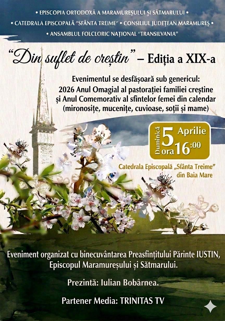 În 5 aprilie, de la ora 16.00, Catedrala Episcopală „Sfânta Treime” din Baia Mare va găzdui ediția a XIX-a a Concertului de Pricesne și Muzică Religioasă „Din suflet de creștin”.