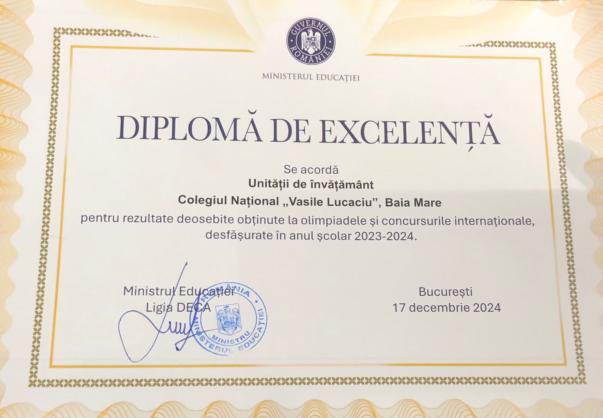 Diplomă de excelență acordată Colegiului „Vasile Lucaciu” pentru rezultatele obținute la olimpiadele și concursurile internaționale