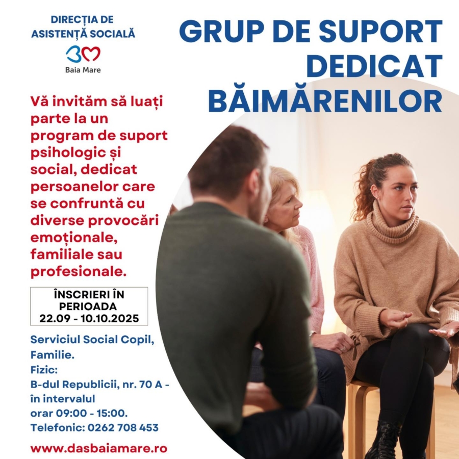 Direcția de Asistență Socială Baia Mare, prin intermediul Serviciului Social Copil, Familie, anunță demararea unui nou program de suport psihologic și social, dedicat persoanelor care se confruntă cu diverse provocări emoționale, familiale sau profesionale.