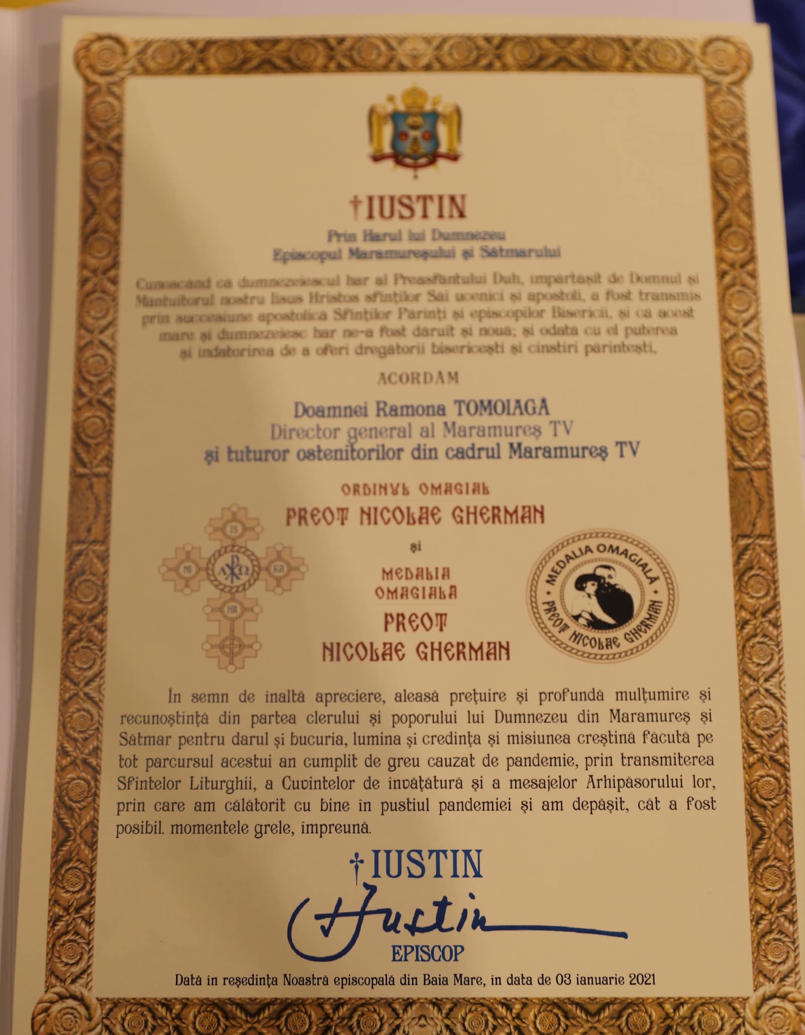 „Am reușit să facem un parteneriat oarecum instituțional și înțelept cu Maramureș TV, televiziunea sufletului nostru. Pe toată perioada stării de urgență și în tot anul, toate evenimentele pe care le-am avut au fost transmise de Maramureș TV. Am transmis toate liturghiile, toate cuvântările și toate mesajele, fapt pentru care vă mulțumim! Aceasta se numește apostolat și misiune. Am sunat-o pe doamna director Ramona Tomoiagă, care este maramureșeancă, moiseiancă de-a noastră și i-am mulțumit. Mi-a răspuns foarte înțelept și frumos. A zis: „Preasfințite, lumea se uită la televiziunile naționale, dar vrea să vă vadă și pe Preasfinția Voastră și să vă audă”. A fost un lucru bun. S-a făcut apostolat și s-a întărit credința poporului, unitatea și comuniunea noastră. Pentru acest parteneriat frumos, care sperăm să continue, îi conferim astăzi distincția anului omagial”, a spun Preasfințitul Iustin.