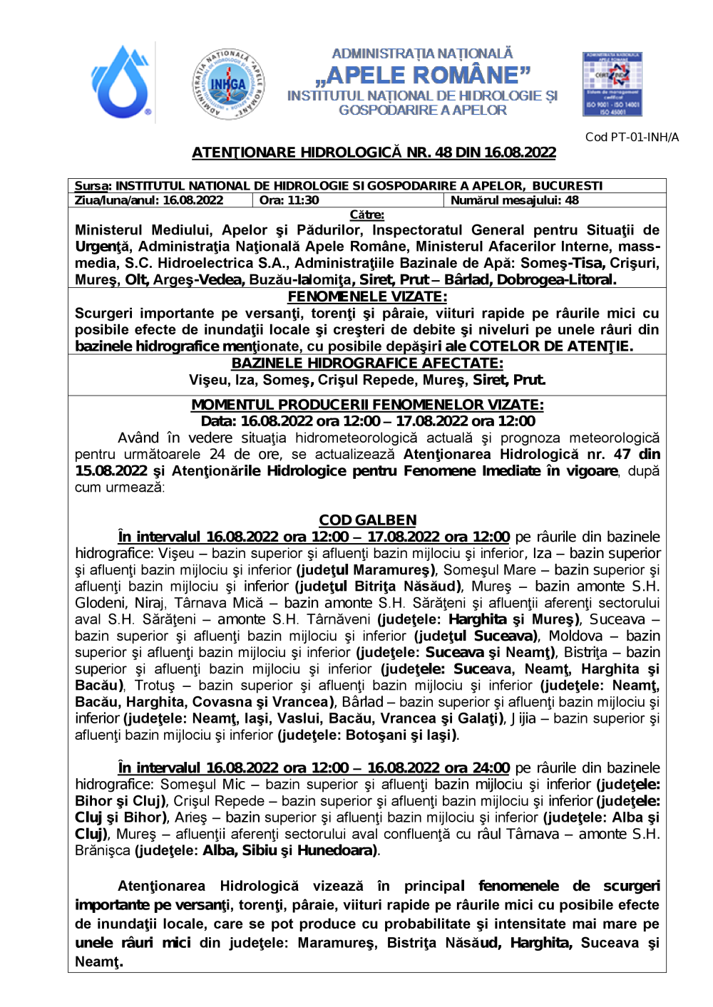 Atenționarea meteoroogică este de tip cod galben, valabil în intervalul 16 august, ora 12:00 – 16 august, ora 22:00. Fenomene vizate: instabilitate atmosferică temporar accentuată.