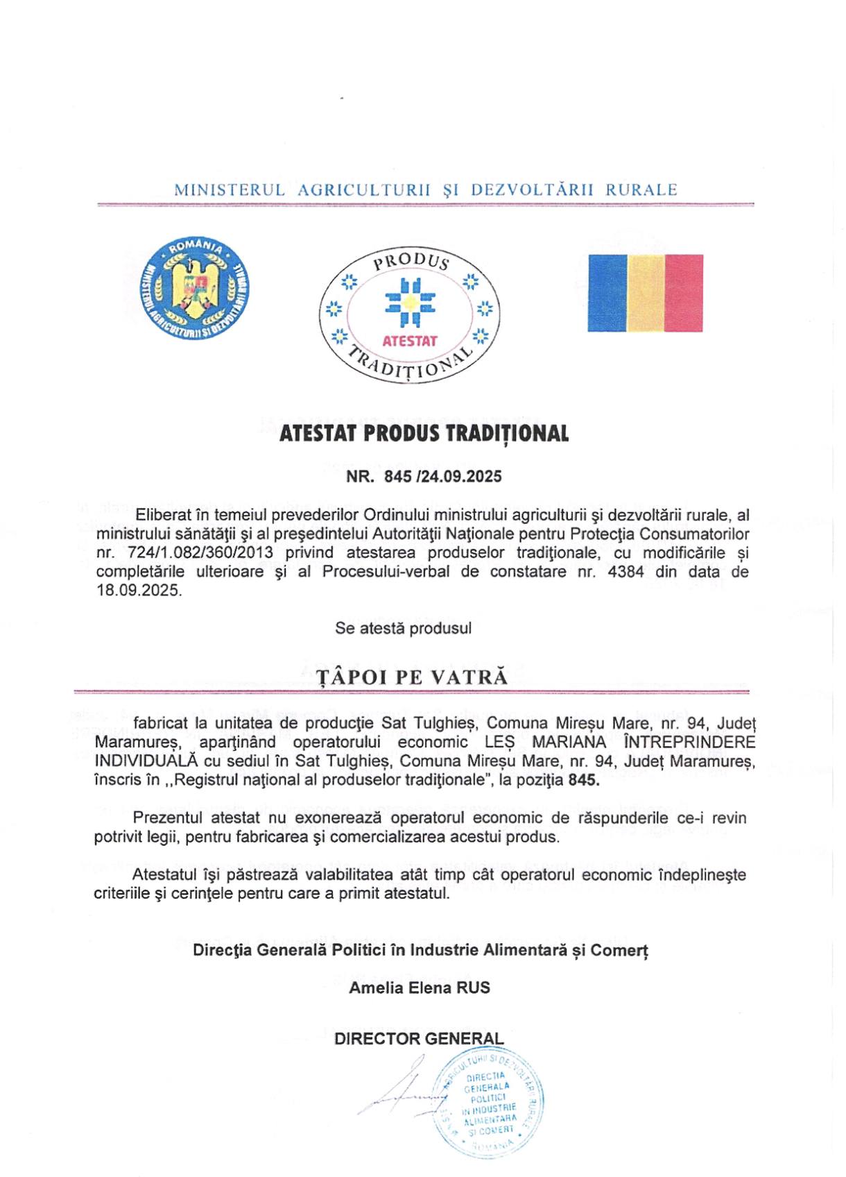 Atestatul îşi păstrează valabilitatea atât timp cât operatorul economic îndeplineşte criteriile şi cerinţele pentru care a primit atestatul”, se arată în documentul eliberat de Ministerul Agriculturii și Dezvoltării Rurale.