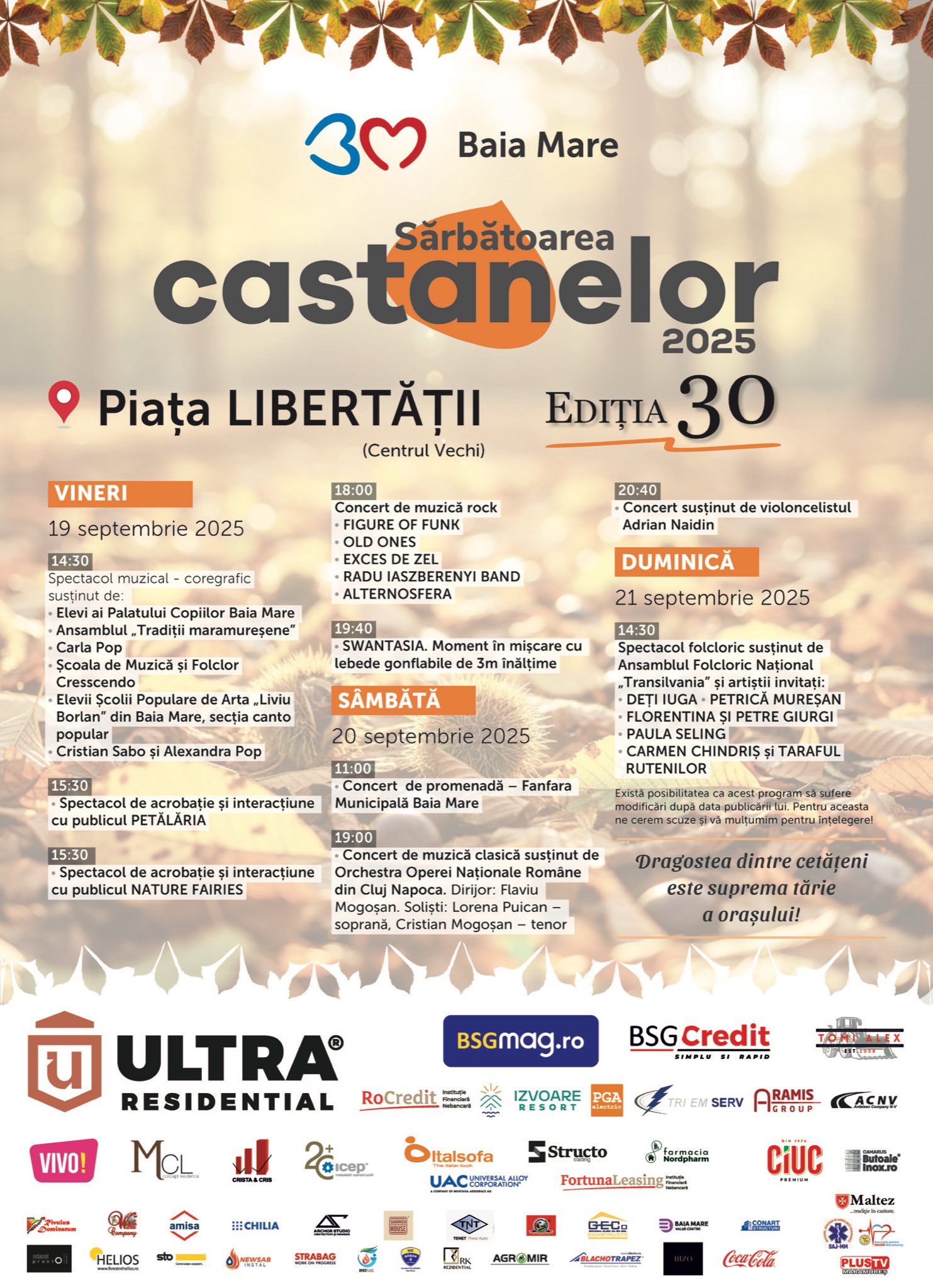 Sărbătoarea Castanelor 2025 transformă, între 19 și 21 septembrie, Baia Mare într-un oraș al bucuriei, tradițiilor și spectacolelor. Timp de trei zile, municipiul se va umple de energie, culoare și muzică, cu scene amplasate în Piața Libertății și pe Bulevardul Unirii, pregătite să ofere publicului experiențe variate.