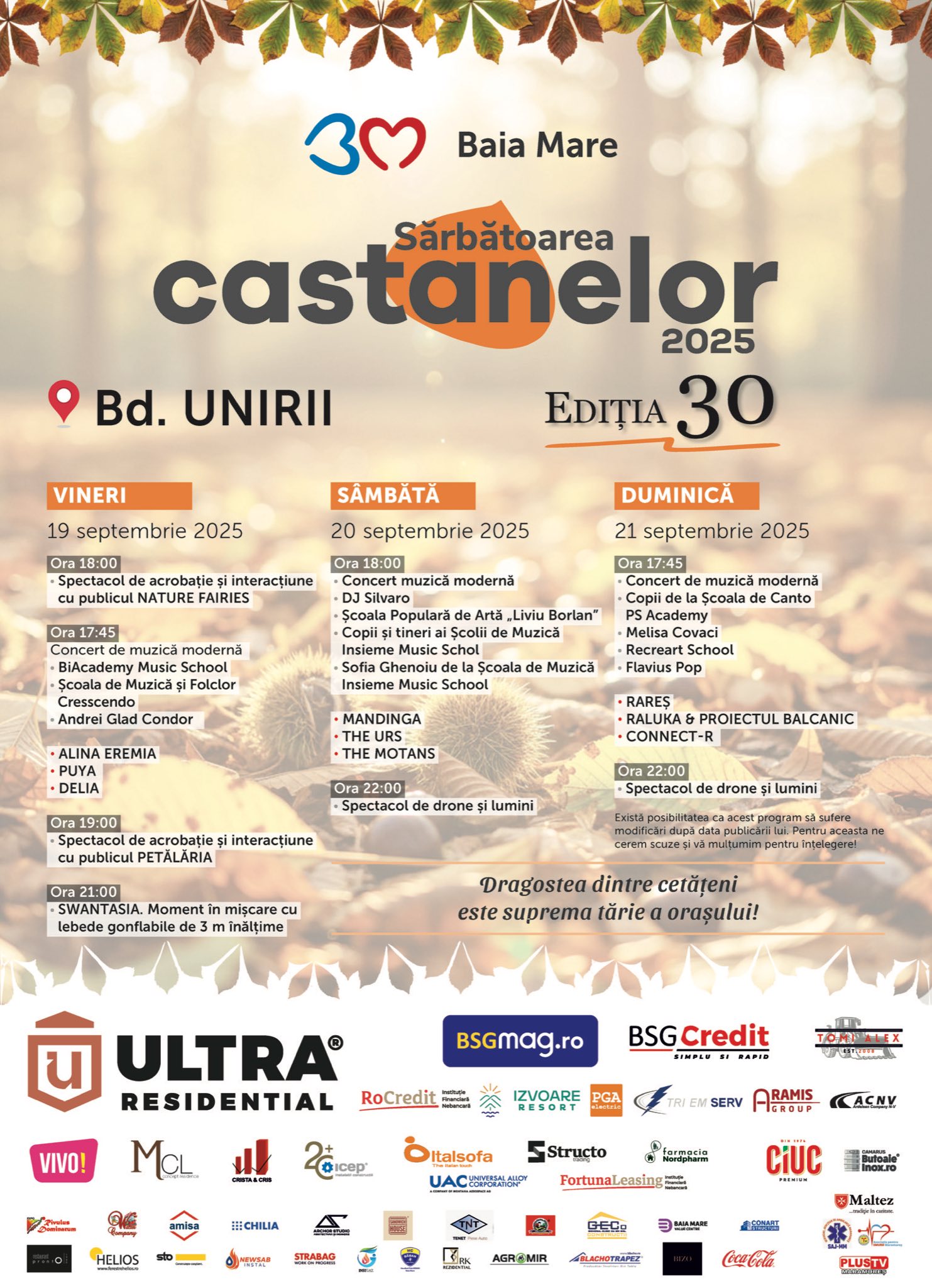 Sărbătoarea Castanelor 2025 transformă, între 19 și 21 septembrie, Baia Mare într-un oraș al bucuriei, tradițiilor și spectacolelor. Timp de trei zile, municipiul se va umple de energie, culoare și muzică, cu scene amplasate în Piața Libertății și pe Bulevardul Unirii, pregătite să ofere publicului experiențe variate.