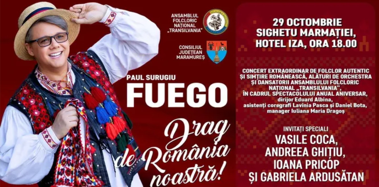 „Drag de România noastră”: Paul Surugiu FUEGO ajunge pentru prima dată la Sighetu Marmației, alături de Ansamblul Folcloric Național „Transilvania”