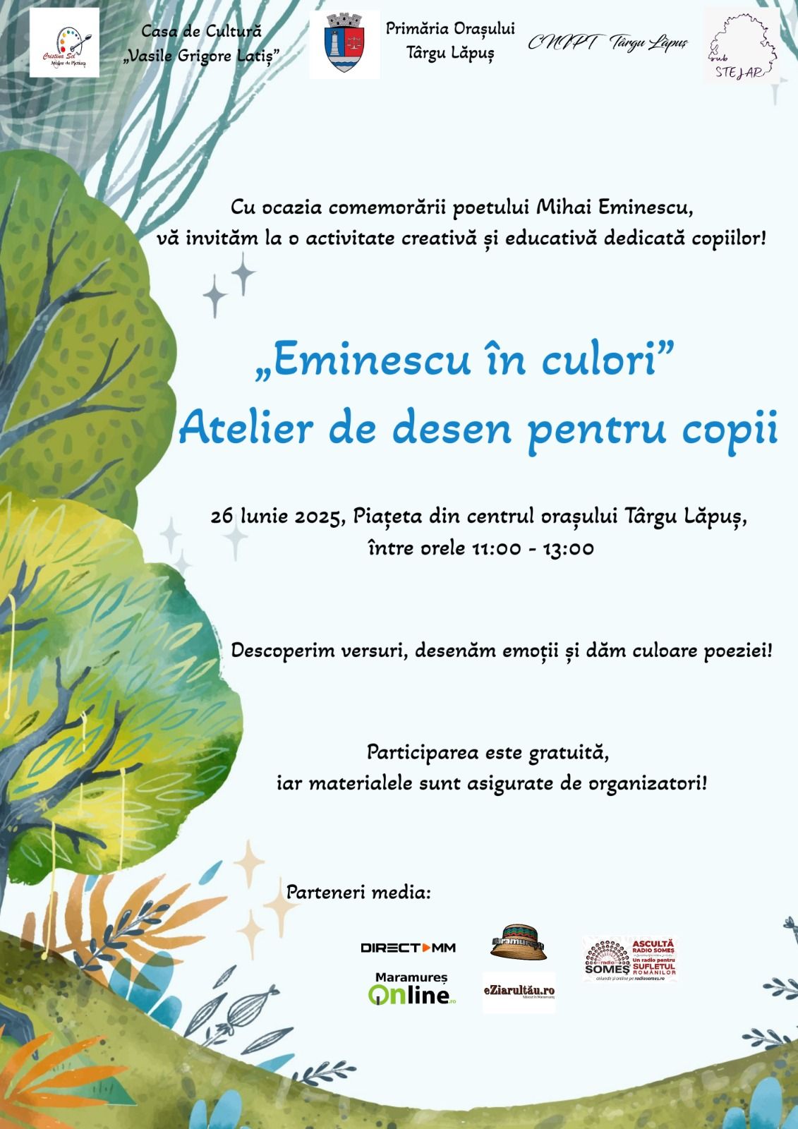 Evenimentul oferă celor mici o ocazie aparte de a intra în contact cu lirica eminesciană într-un mod personal, prin desen și interpretare liberă. Este o întâlnire între poezie și culoare, între sensibilitate și joc, care încurajează exprimarea artistică într-un cadru deschis și prietenos. Participarea este gratuită, iar toate materialele necesare vor fi puse la dispoziție de organizatori”, precizează Centrul de Informare Turistică Târgu Lăpuș.