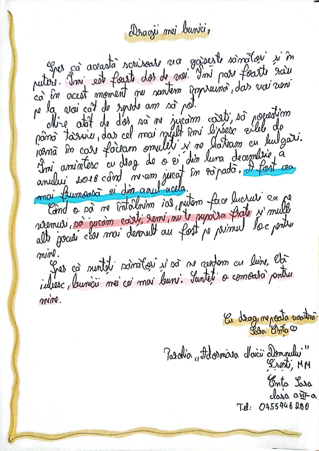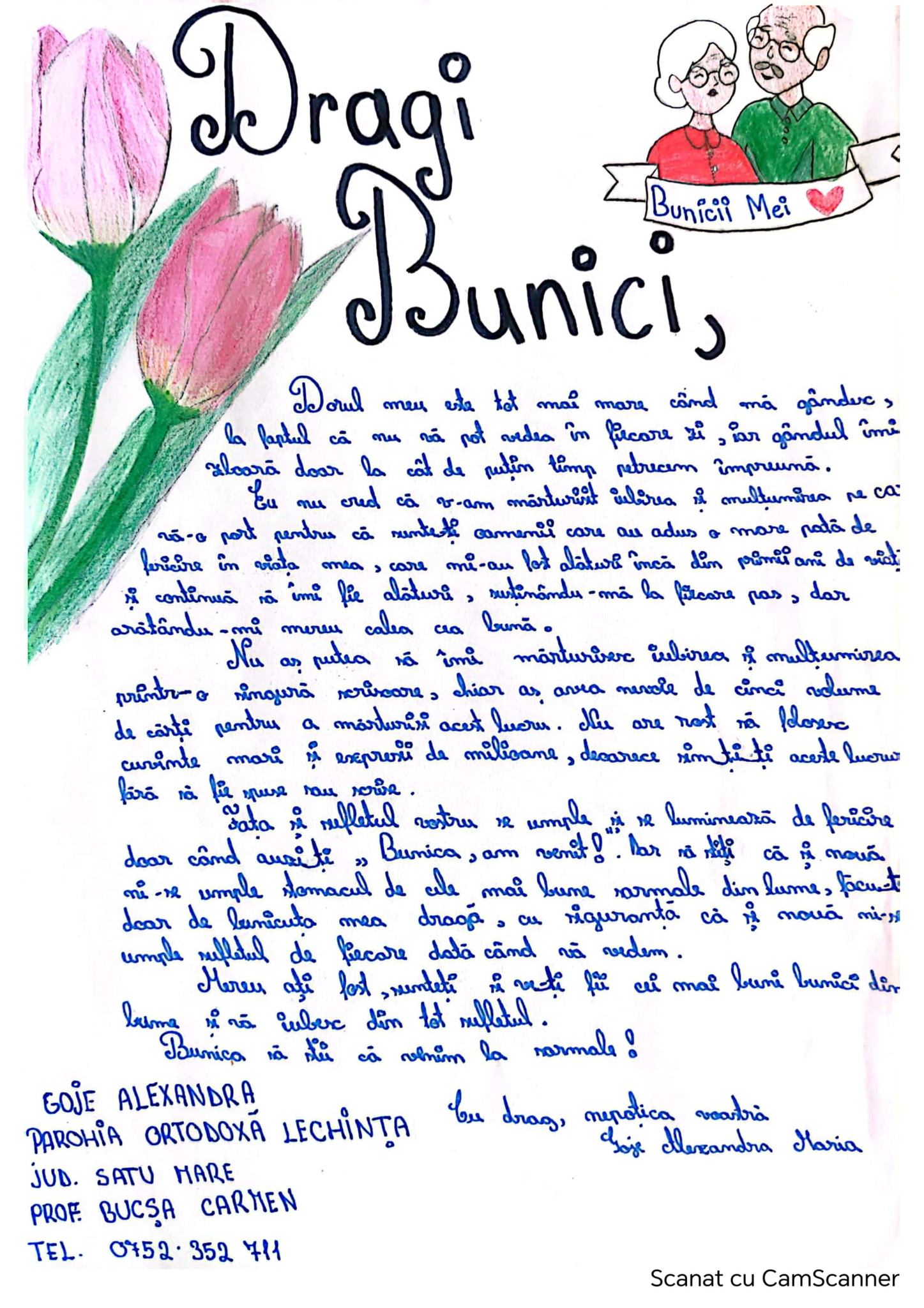 La acest proiect de suflet au avut posibilitatea să participe elevi din toate ciclurile de învățământ (primar, gimnazial și liceal), care, prin intermediul alcătuirii unei scrisori, au dorit să împărtășească bunicilor câteva gânduri frumoase și unice, de dor, de dragoste, de bucurie și recunoștință pentru faptul că îi cresc sau i-au crescut pe brațele lor.