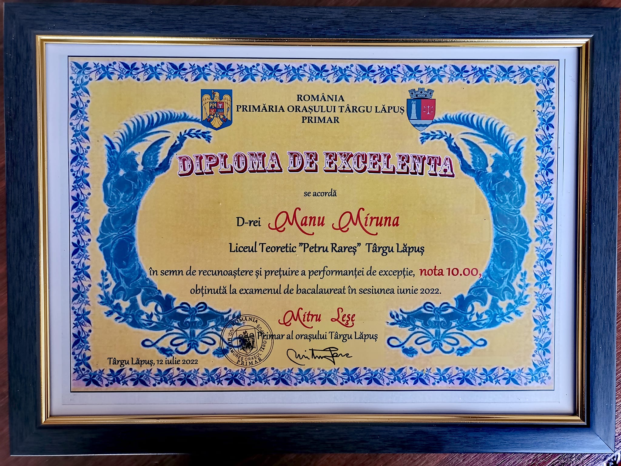 Viitoarea studentă, Manu Miruna, elevă a Liceului Teoretic „Petru Rareș” Târgu Lăpuș, a fost premiată săptămâna aceasta de primarul orașului Târgu Lăpuș în semn de recunoaștere și prețuire a performanței de excepție, nota 10, obținută la examenul de bacalaureat în sesiunea iunie 2022, arată administrația locală.
