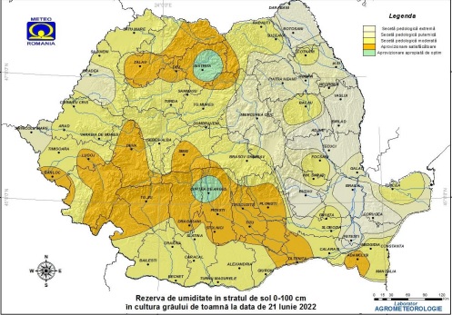 În prezent, conținutul de apă pe profilul de sol 0-100 cm în cultura grâului de toamnă se încadrează în limite scăzute (secetă pedologică moderată) și deosebit de scăzute (secetă pedologică puternică și extremă) în Moldova, Crișana și Maramureș (jumătatea vestică a Maramureșului), pe suprafețe extinse din Dobrogea și Transilvania, local în nordul, estul și sudul Munteniei, estul, centrul și sudul Olteniei, nordul și nord-vestul Banatului. Rezerva de umiditate din sol prezintă valori satisfăcătoare și izolat aproape de optim, local în nordul, vestul, centrul și sudul Olteniei, nord-estul și vestul Banatului, nordul, izolat sudul și sud-vestul Transilvaniei, sud-vestul Dobrogei.