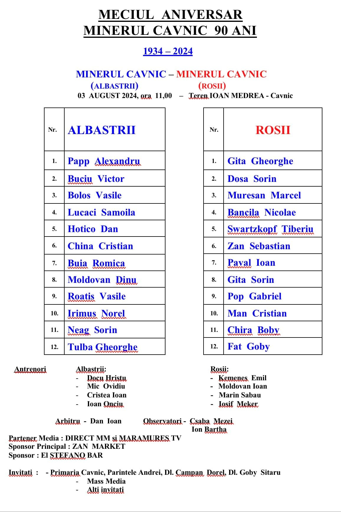 Evenimentul va debuta cu întâlnirea tuturor participanților la stadionul Minerul Cavnic (cunoscut și sub denumirea de Stadionul „Ioan Medrea”), prilejuită de meciul aniversar care va avea loc cu începere de la ora 11.00.