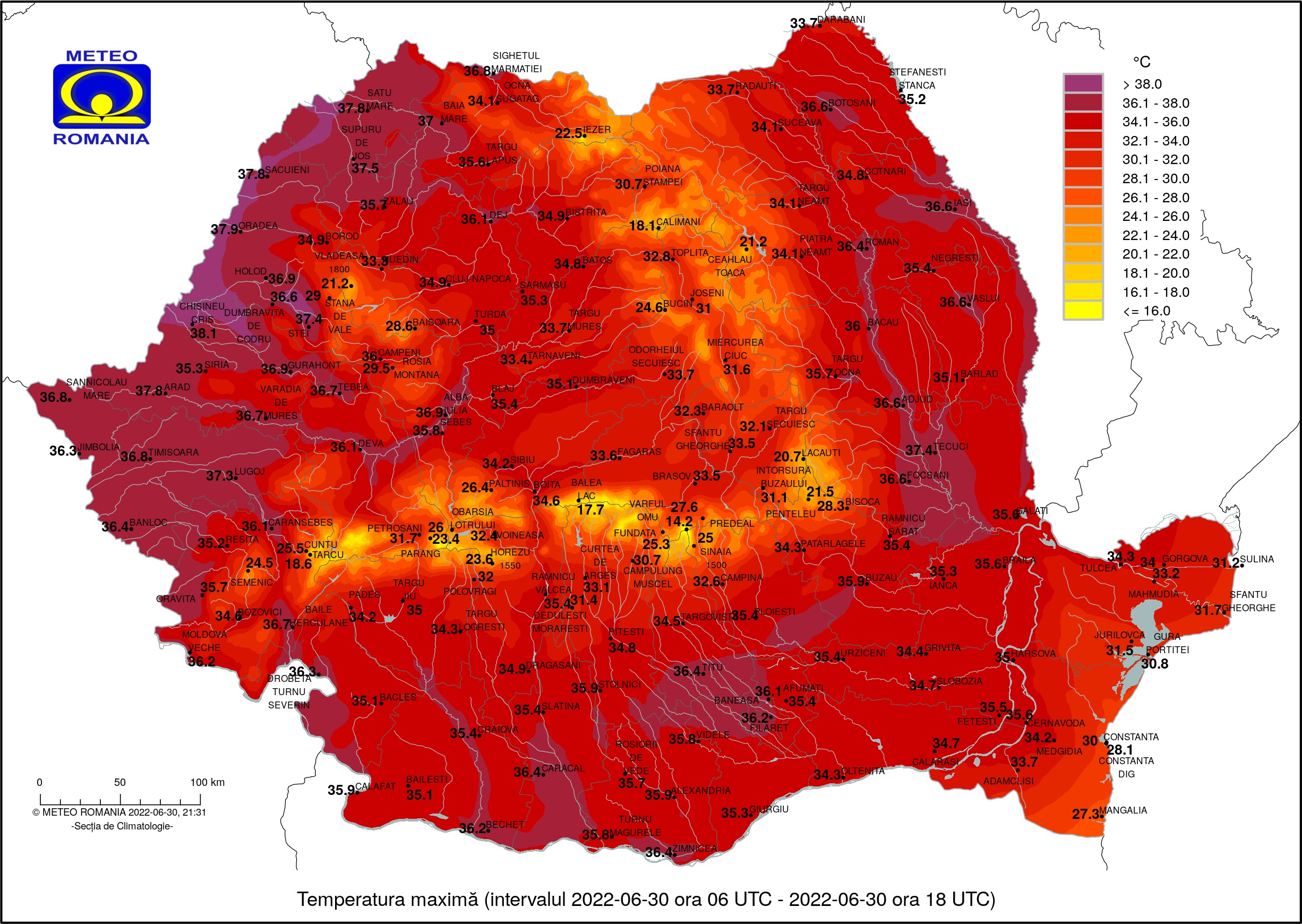 Temperatura maximă absolută înregistrată în județul Maramureș este de la stația meteorologică Baia Mare: 39.5 grade Celsius și datează din 25 iulie 2012. Dar recordul lunii iunie era de 35,2 grade și data din 24 iunie 2021. Vă amintiți, desigur, că anul trecut era emis în premieră cod roșu de caniculă și disconfort termic pentru nord-vestul țării, inclusiv Maramureș, fiind, totodată, și cel mai timpuriu din istoria măsurătorilor din țara noastră. Recordul a fost bătut miercuri, 29 iunie 2022, valoarea nouă fiind de 35,9 grade Celsius. A ținut o zi recordul! Azi, 30 iunie, avem unul nou pentru luna iunie: 37 grade Celsius. Vom afla valoarea exactă către seară sau dimineață. ANM arată că ar fi 37 fix!