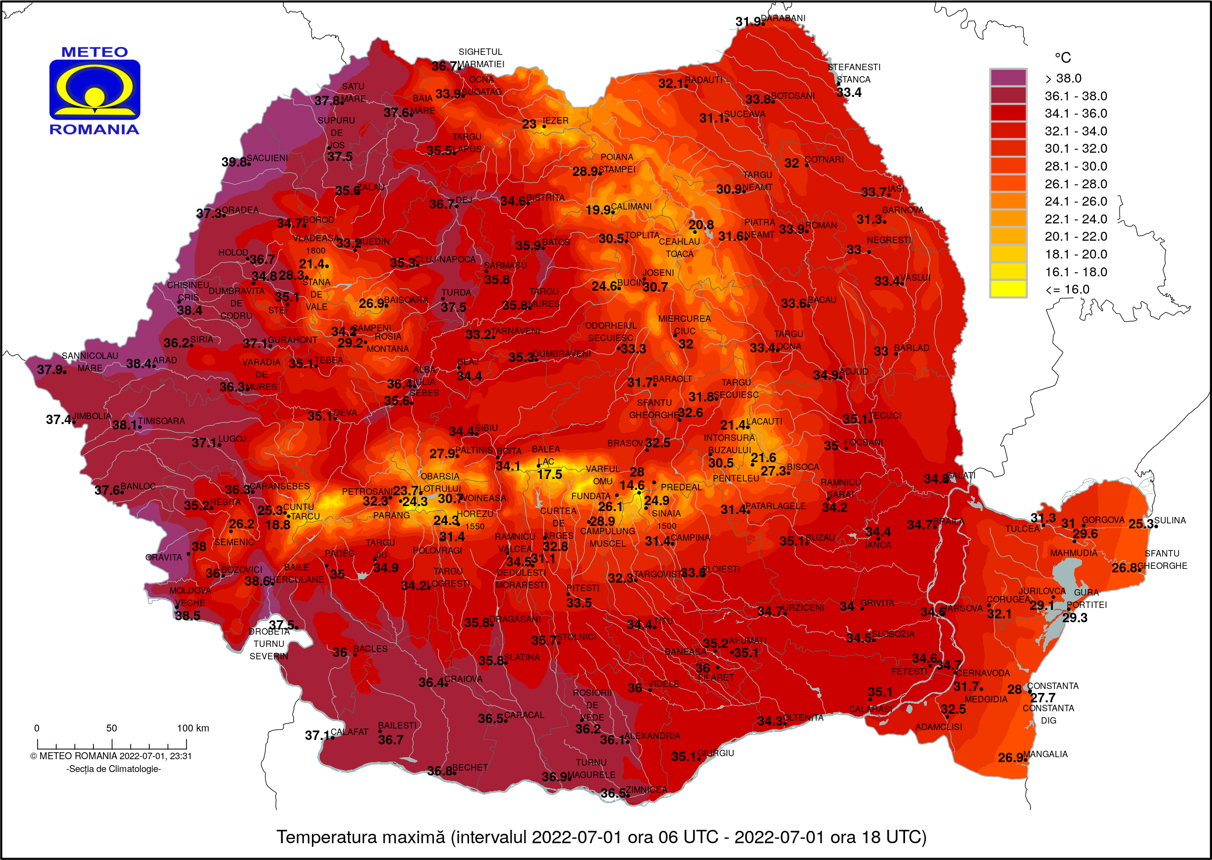 Ziua de 1 iulie vine cu alte recorduri. Să explicăm în ce sens! Chiar dacă în Maramureș nu s-a depășit recordul lunii iulie și totodată all-time, adică acel 39,5 grade, are acum recordul verii 2022 din punct de vedere termic. Recordul absolut de până acum este acest 37,6 grade de la stația meteo Baia Mare, dobândit și pe cer parțial acoperit, în condițiile în care codurile roșu din aria joasă și codurile galben din aria montană, ambele de caniculă, au fost dublate de un cod galben de instabilitate atmosferică și practic aria municipiului Baia Mare s-a înconjurat de vijelii. Am avut 36,7 grade în Sighetu Marmației, 35,5 grade în Târgu Lăpuș, 33,9 grade la Ocna Șugatag și 23 grade la stația meteo Iezer.