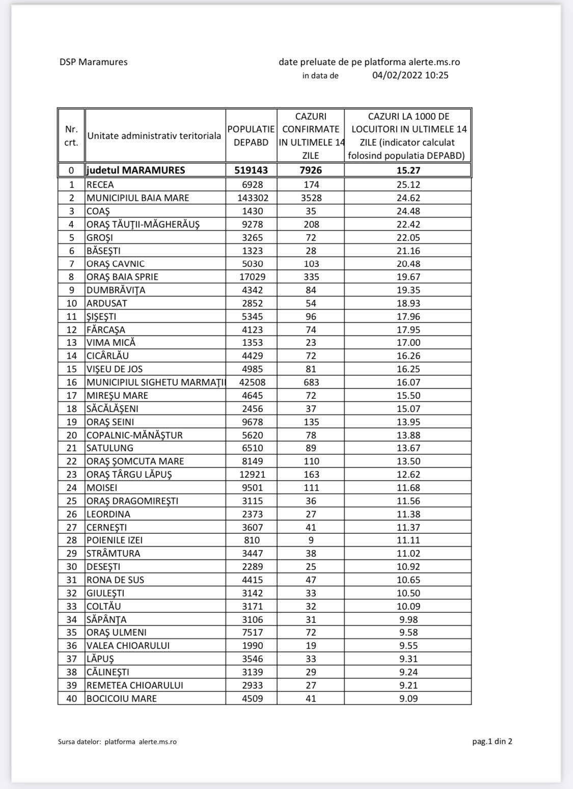 La polul opus al clasamentului se află comuna Recea, cu 174 cazuri în 14 zile și incidență peste Baia Mare. „Noi ne testăm. Ne testăm mult. Cum avem unele suspiciuni, facem teste. Chiar și eu, pentru siguranță, până luni (n.red. 7 februarie) stau acasă, chiar dacă sunt negativ. Nu dorim să riscăm viața nimănui. Știm ceea ce înseamnă acest virus și la primele simptome recomandăm izolarea pentru că așa este cel mai bine”, arată pentru DirectMM.ro Pavel Octavian, primarul comunei Recea.