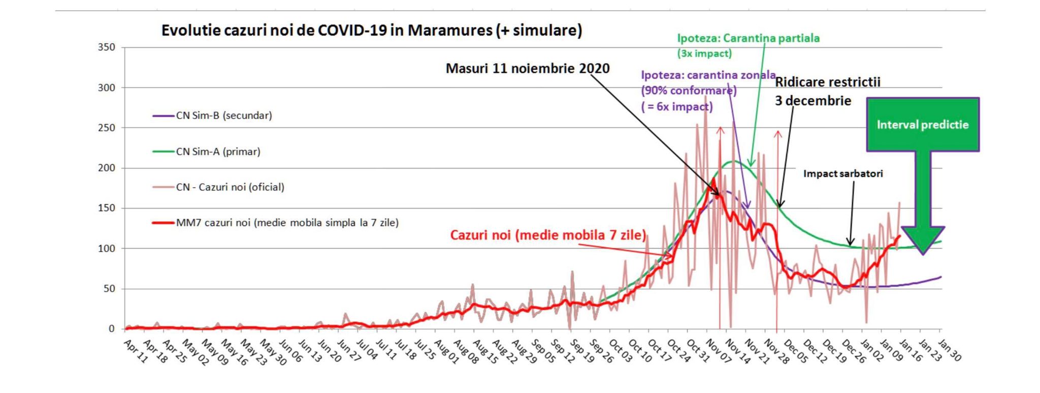 În opinia specialistului, am putea avea, zilnic, în Maramureș, aproximativ 150 cazuri pe finalul lunii ianuarie și începutul lunii februarie și un scenariu roșu la nivel județean. Cel mai probabil, vom avea parte de noi restricții, care, oricât de nepopulare sunt, par a fi absolut necesare. Maramureșul este evidențiat de specialistul contactat de noi ca fiind un exemplu pozitiv. Însă, cu toate acestea, nu ne așteaptă săptămâni ușoare, ca urmare a relaxărilor din ultima vreme. Ține de noi ca efectele negative să fie cât mai reduse! Respectați regulile! Ce ne costă mai mult? O mască purtată în spațiile publice sau o viață? Răspunsul ar trebui să fie evident! Tot în încheiere, vrem să menționăm că previziunile specialistului, bazate pe informații reale, s-au adeverit, motiv pentru care trebuie luate în mod absolut în considerare! Vom reveni cu detalii!