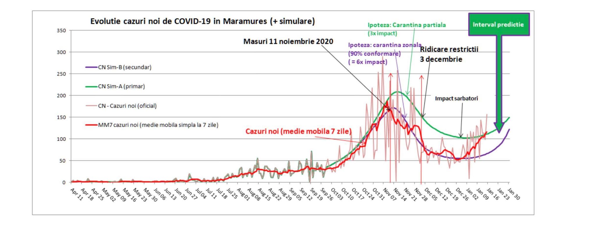 La acea data impactul sarabatorilor nu a fost inclus pentru ca nu se stia daca guvernul va lua sau nu masuri suplimentare dupa alegerile din 7 decembrie. Din pacate impactul sarbatorilor a inceput deja sa fie vizibil inca de la inceputul anului 2021 iar acum numarul de cazuri noi in Maramures se afla pe un trend rapid ascendent.