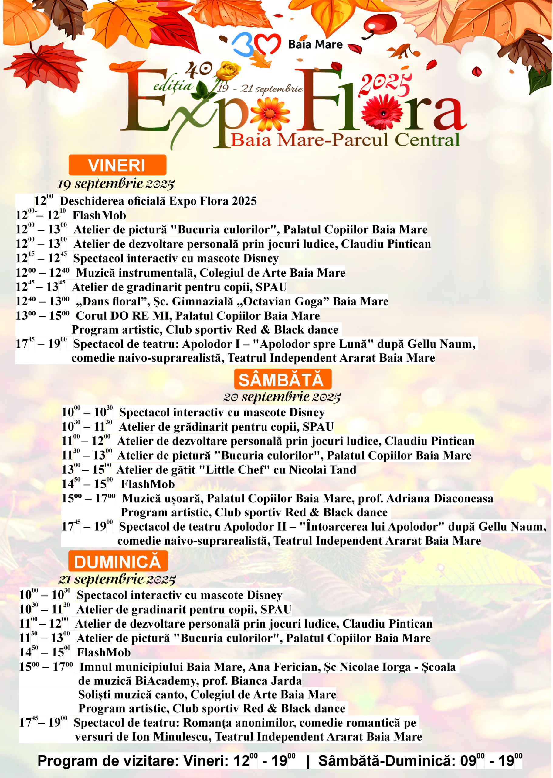 Organizată de Serviciul Public Ambient Urban, expoziția promite o atmosferă de poveste, plină de culoare, spectacole și activități pentru toate vârstele. Acesta se va desfășura în Parcul Central din Baia Mare.